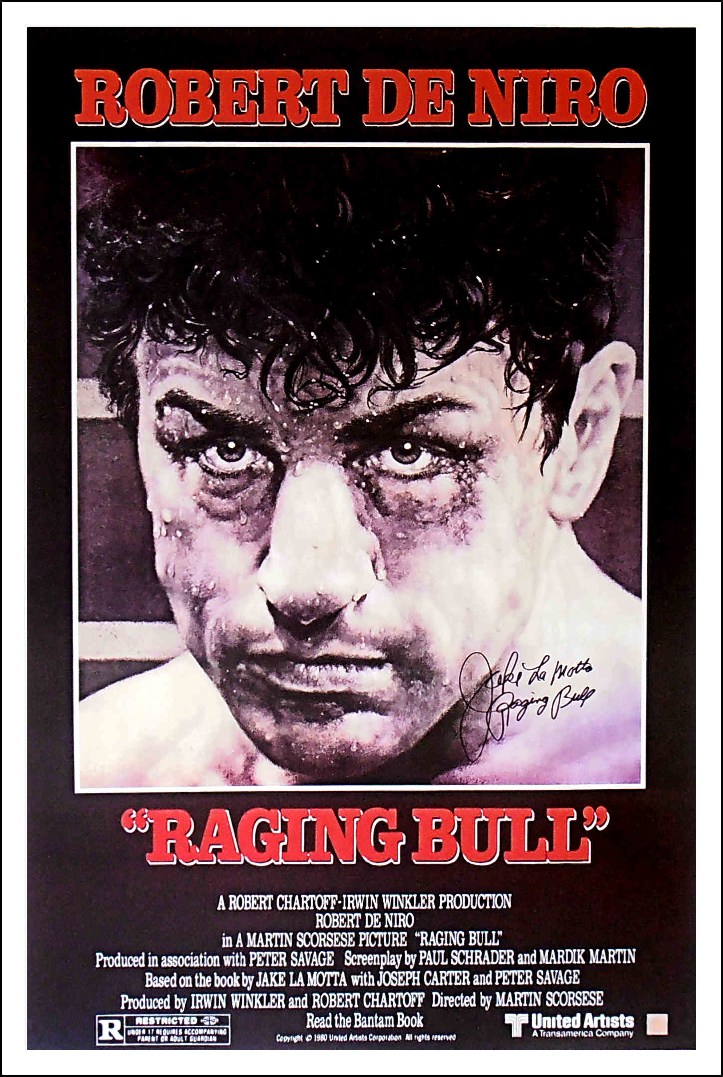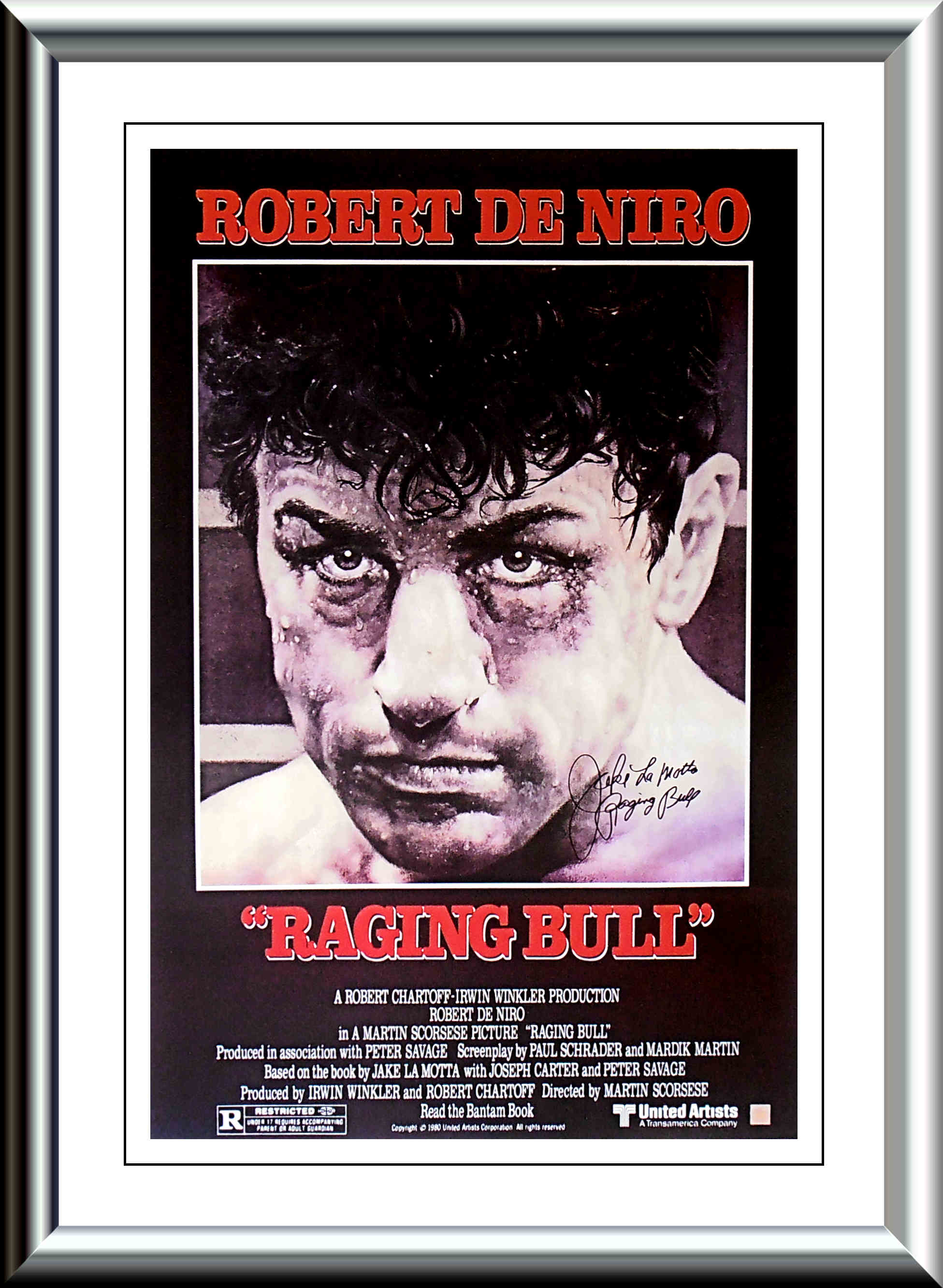 Description : Here we have the movie poster from the iconic movie that portrayed Jake LaMotta, the Middleweight Champion of the World. He has signed this poster RAGING BULL! He part was portrayed by Robert De Niro, this is without doubt the best movie about a boxer & a time in boxing, ever made.