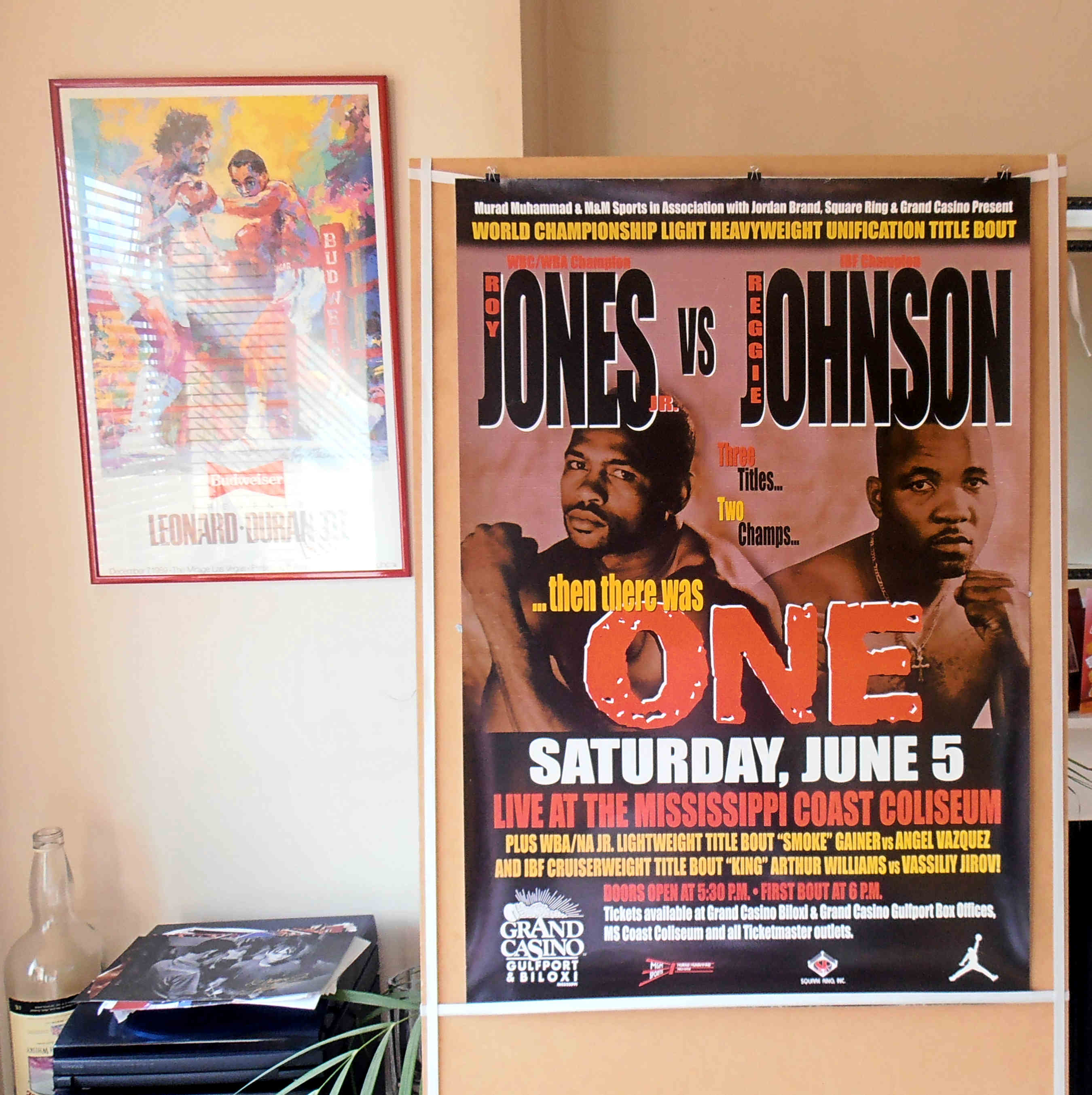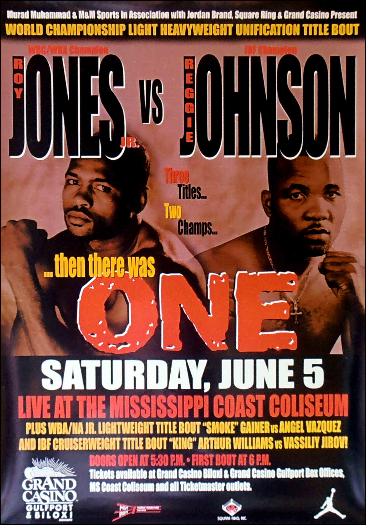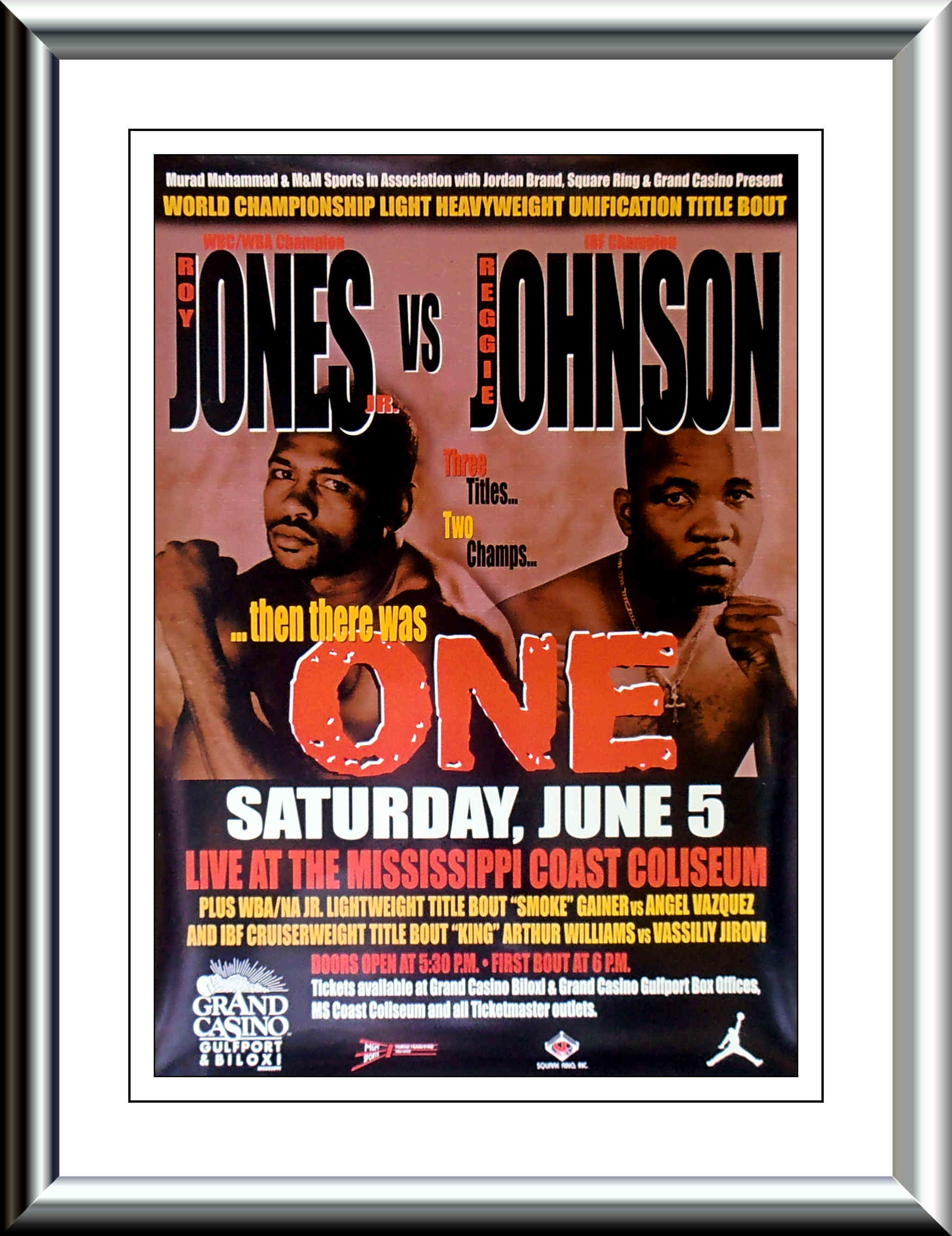 Description : Here we have an original full-size onsite boxing fight poster for the WBC/WBA/IBF world light-heavyweight championship unification title bout held at the Grand Casino, Biloxi, Mississippi, USA, 5th June 1999.