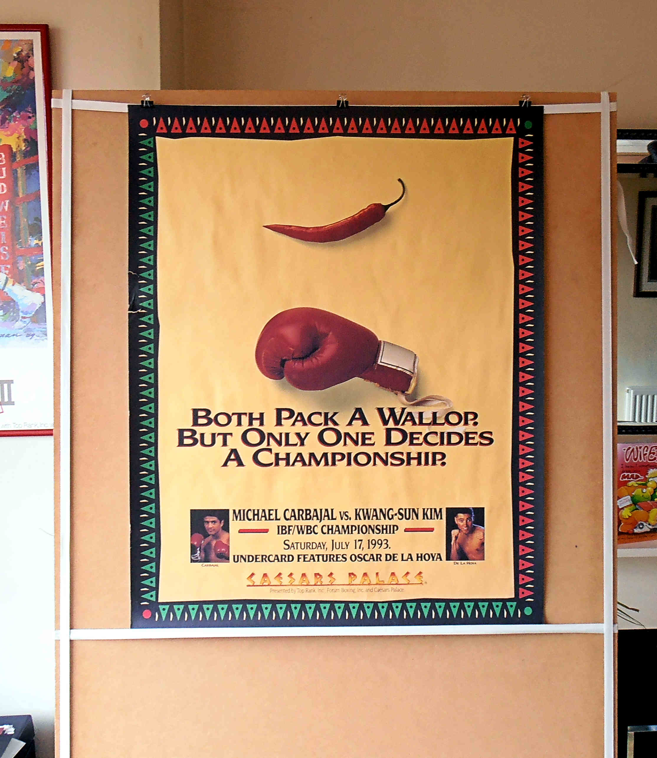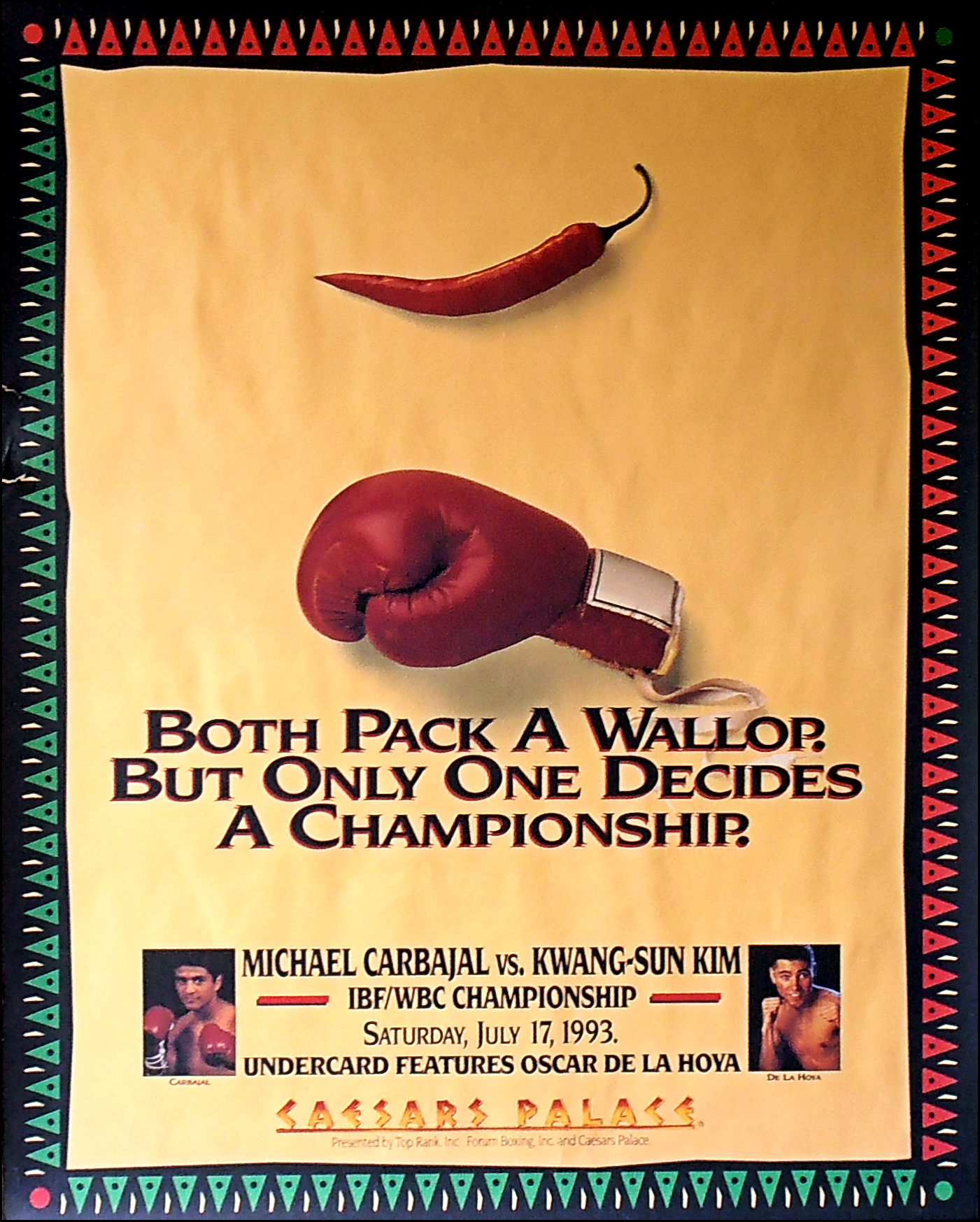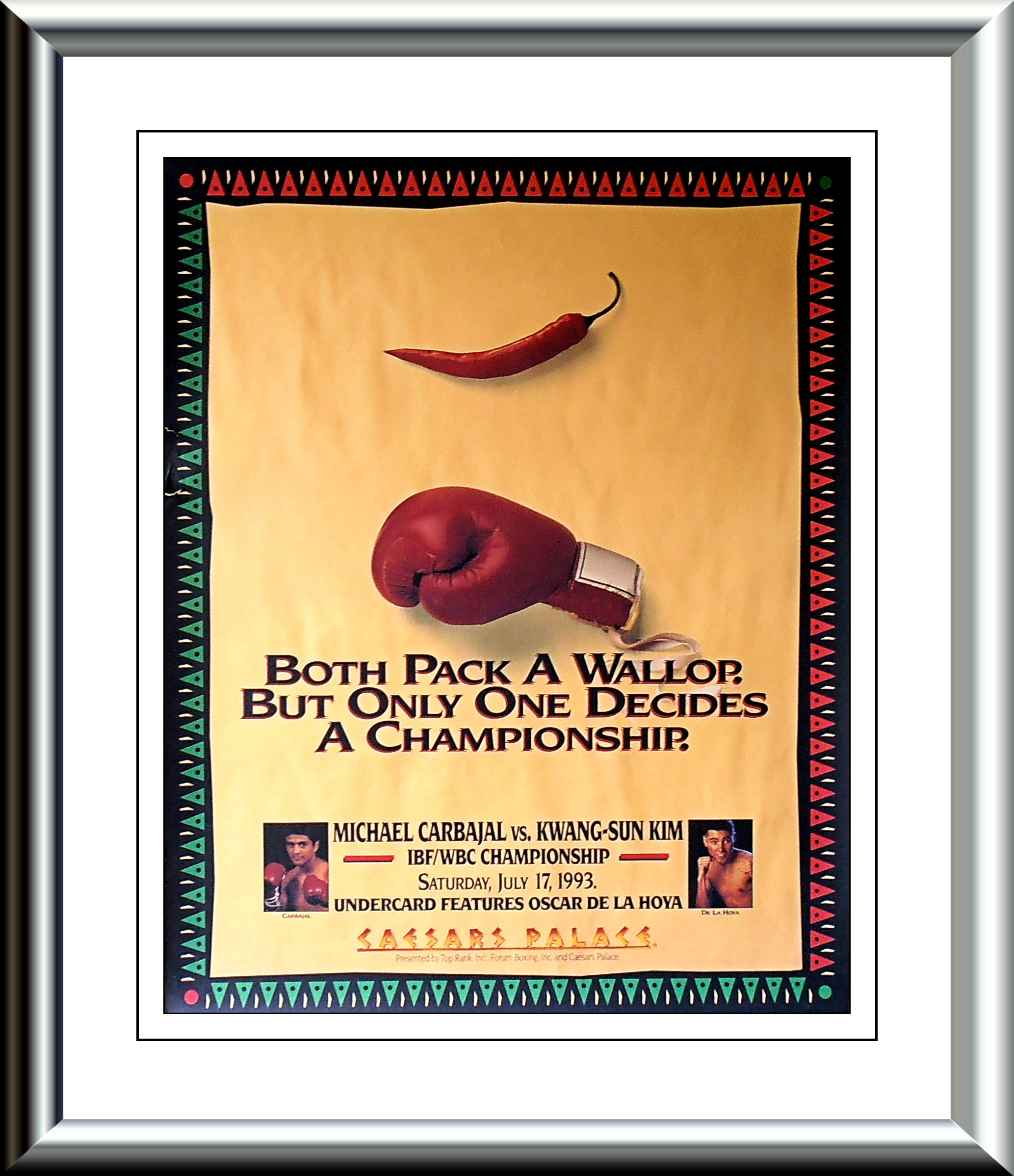 Description : He we have a great onsite poster from Caesars Palace, Las Vegas for the main event between reigning & defending IBF World Light/Flyweight Champion Michael Carbajal & challenger Kwang Sun Kim. This was Carbajal's 1st defence of his unified title's after his epic victory over Humberto Gonzalez in their 1st encounter of that epic trilogy. Carbajal took care of business by stopping Kim by 7th round TKO.