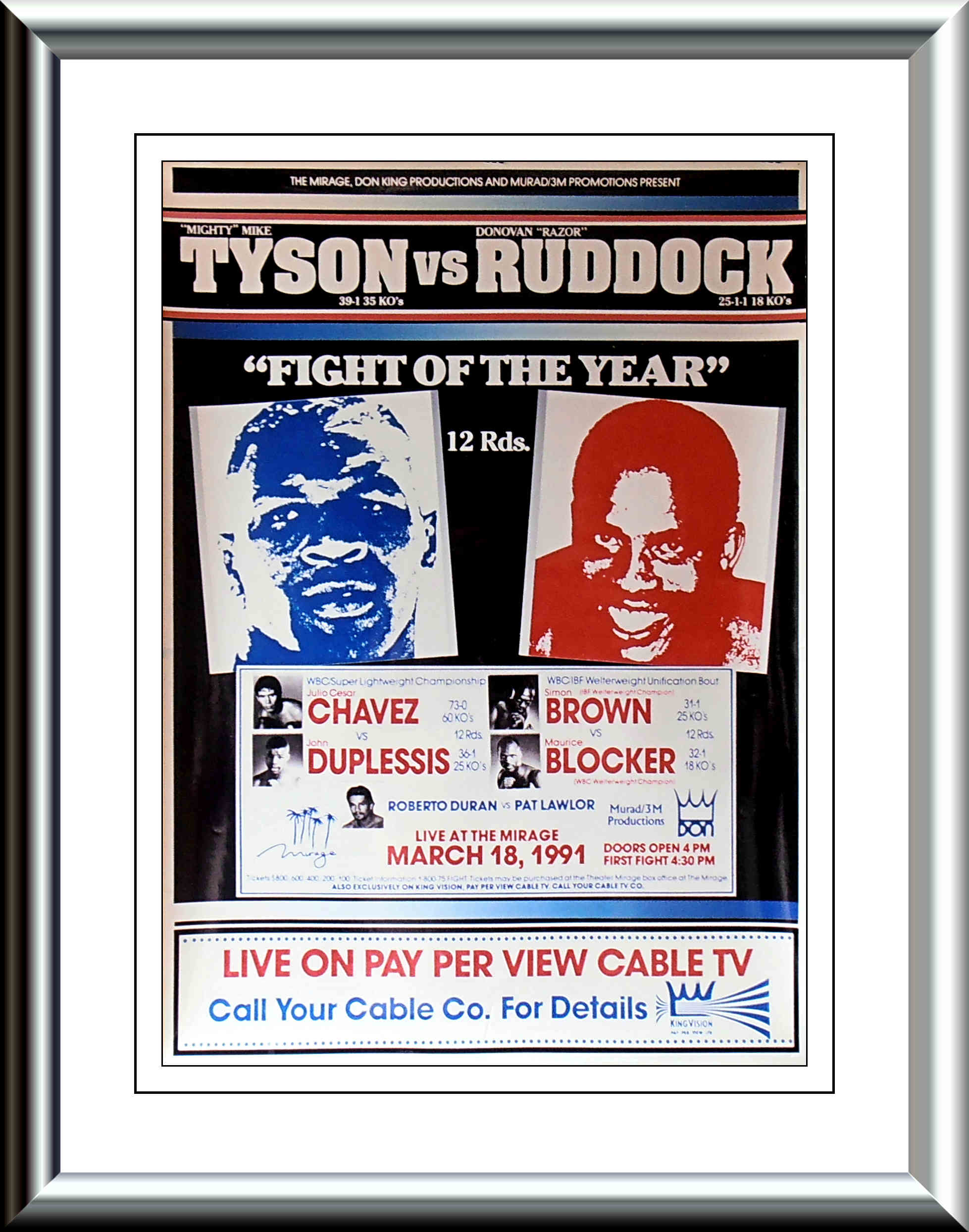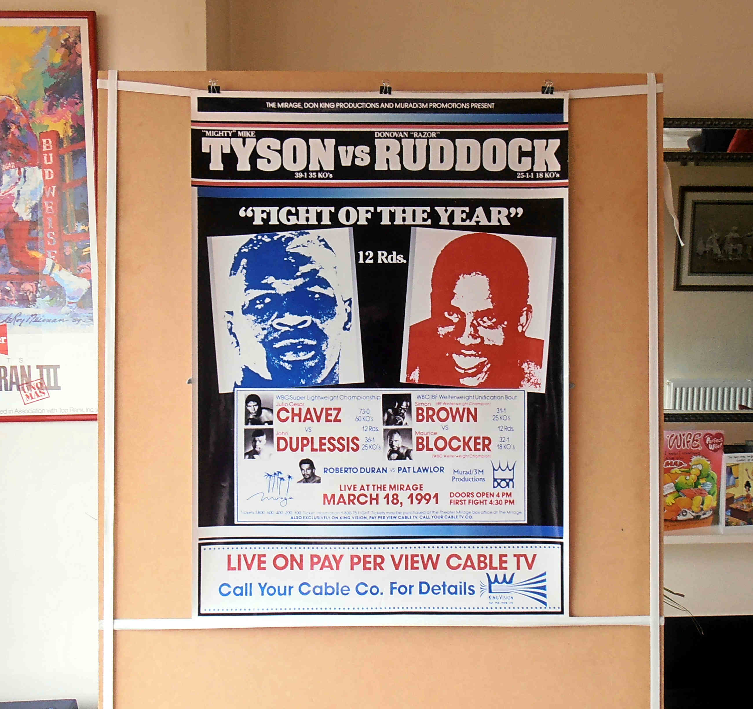 Description : Here we have the onsite poster produced by the Mirage/Don King Productions for the 1st collision between Mike Tyson & No2 Heavyweight contender Donovan "Razor" Ruddock.