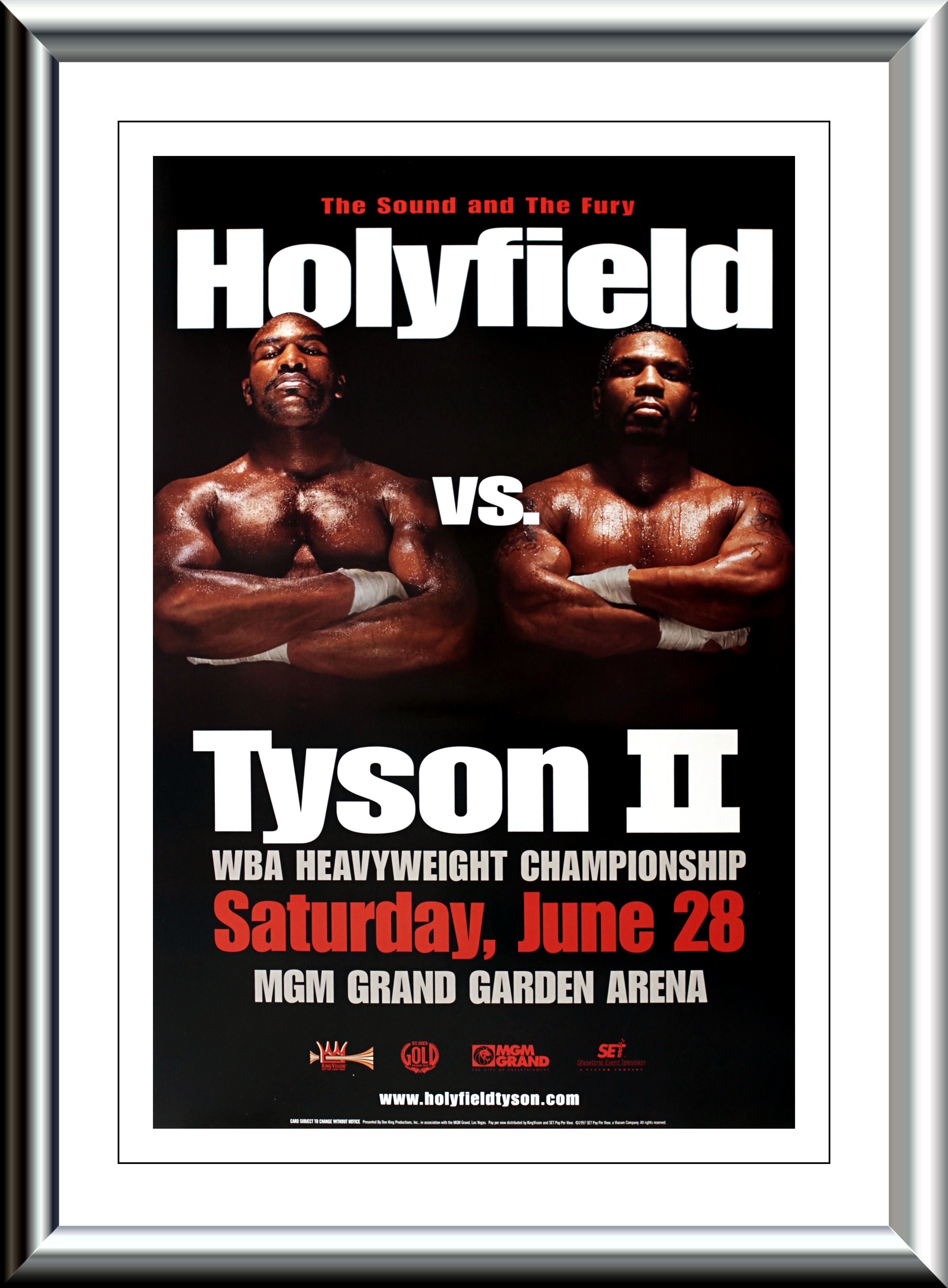 Description : Here we have an original onsite poster from that infamous night at the MGM Grand Las Vegas where Mike Tyson got himself thrown out of the ring by referee Mills Lane for biting a chunk out of Evanders ear in the 3rd round. I was one of the very fortunate few who had a ticket for this mega event shocker! It's a night I'll never forget, inside the ring & out of it, the MGM went into lockdown for 1 hour to try & contain the chaos that spilled out of the arena & into the main casino. A lunatic night all round.....