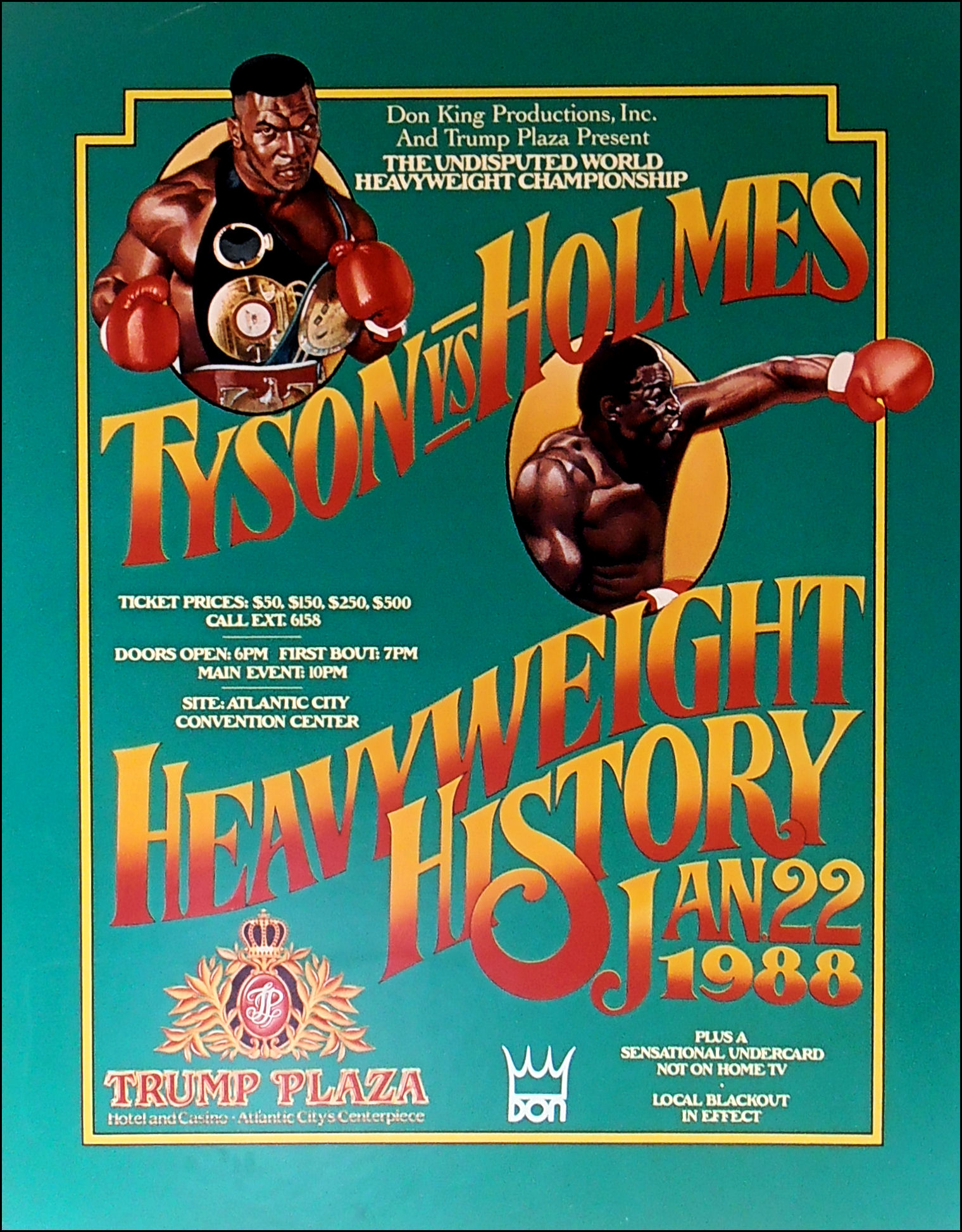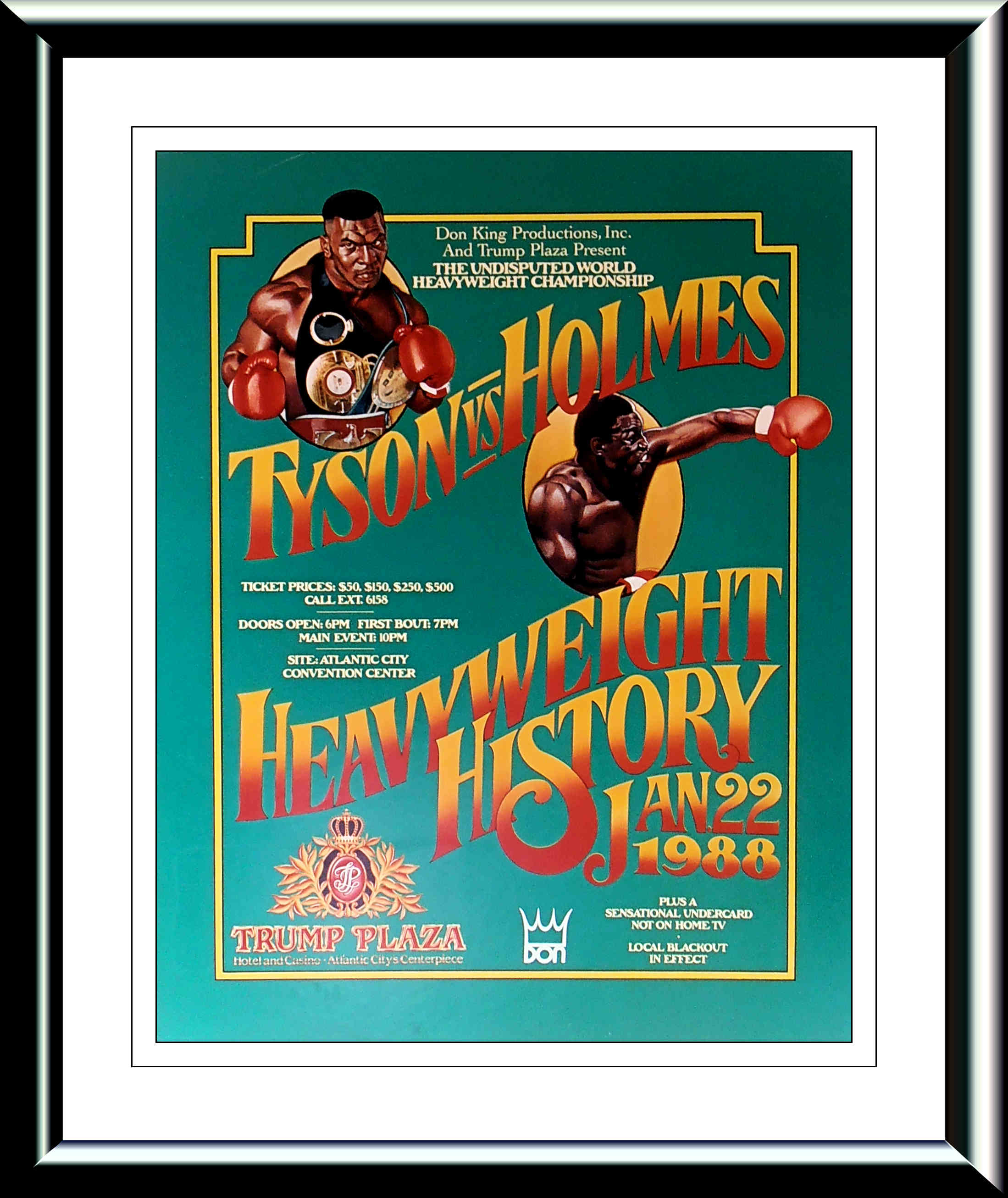 Description : Here we have a mega rare vintage original onsite cardboard poster from the Trump Plaza Atlantic City for the fight billed as "Heavyweight History", for the WBA, WBC and IBF Heavyweight Championships on January 22, 1988. I was fortunate enough to have obtained this poster from Mike Tyson's former assistant manager & friend Mr Steve Lott, you can see Steve in the corner with trainer Kevin Rooney at all Mikes early fights before Don King appeared on the scene.