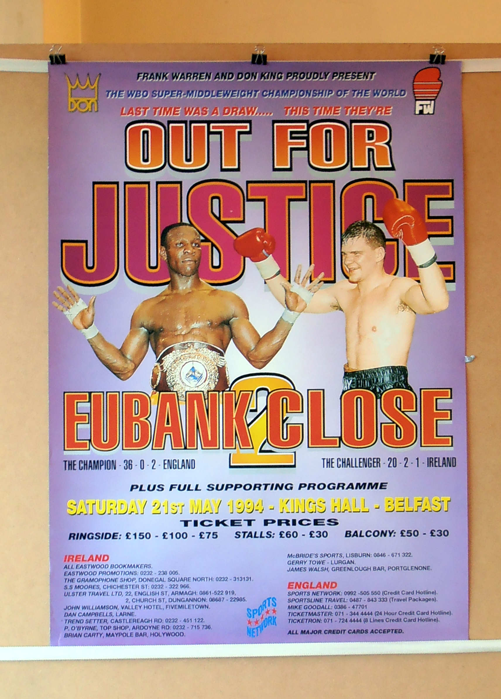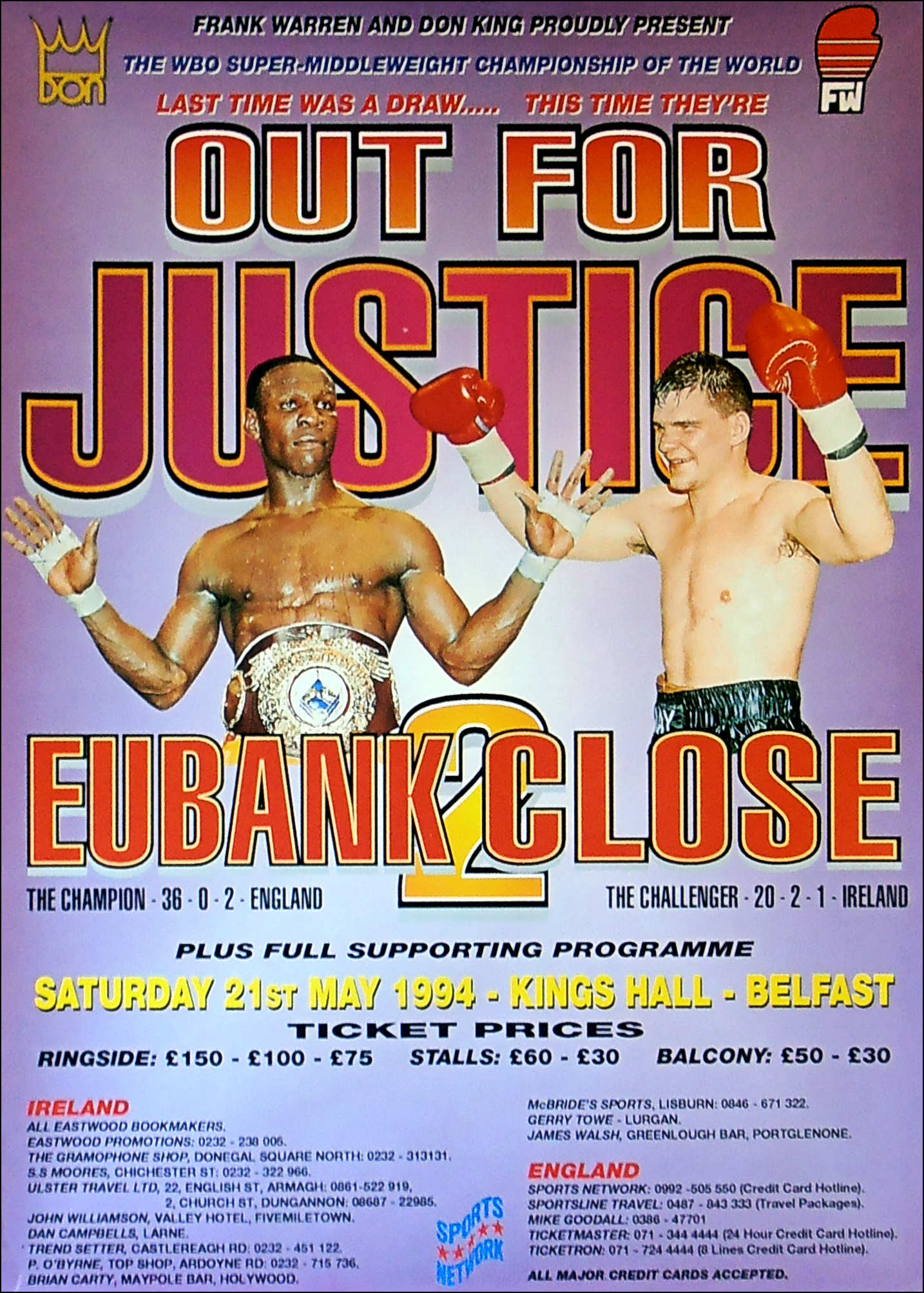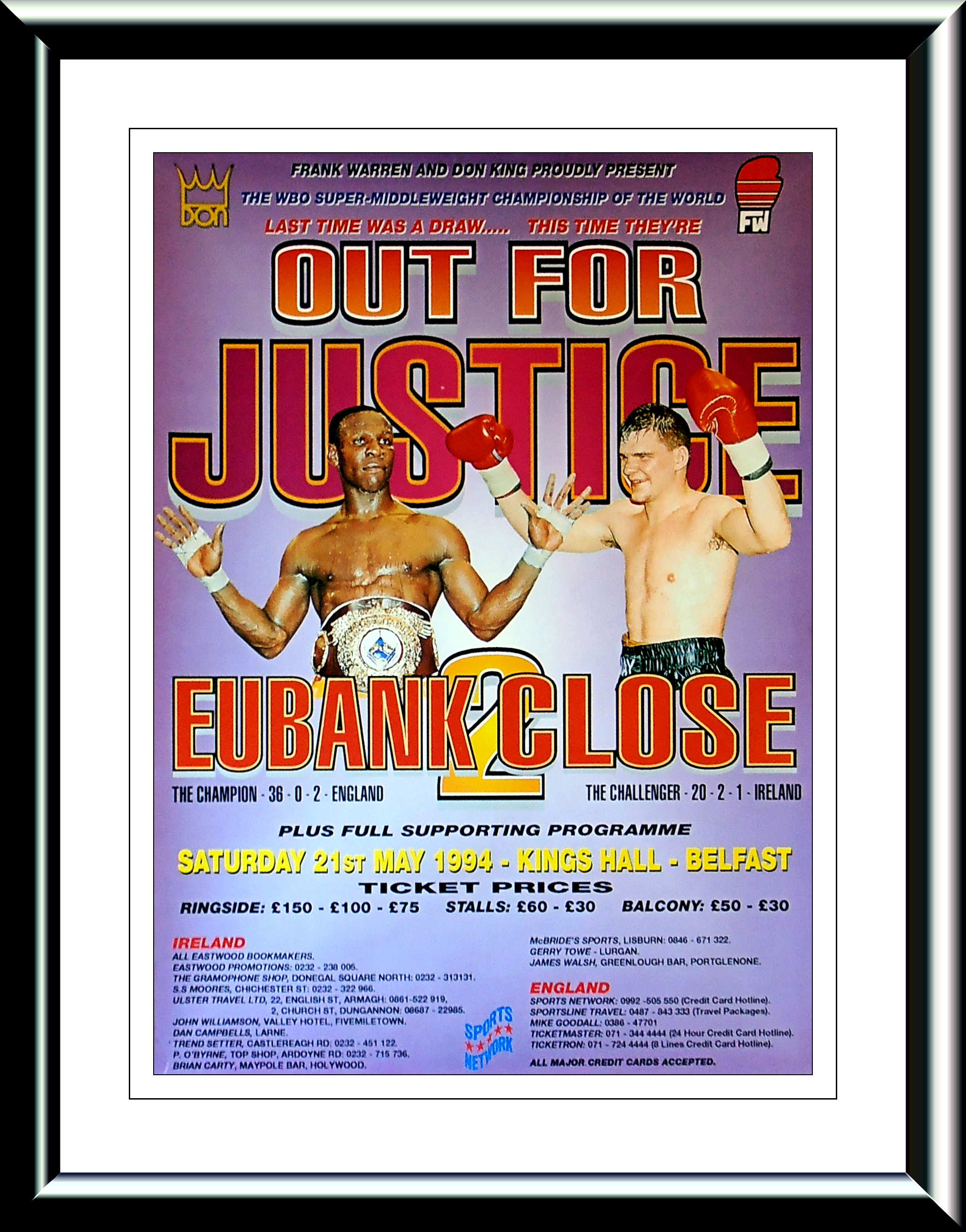 Description : He we have an Official Frank Warren & Don King Productions Boxing promotional Poster for the Chris Eubank V Ray Close rematch for the WBO Super/Middleweight Title held at the King's hall, Belfast. The 1st fight was scored a draw so a rematch was ordered & Eubank ran out a split decision winner in another very tight affair. | judge: Roy Francis 114-117 | judge: Clark Sammartino 115-114 | judge: Eugene Glenn 118-112