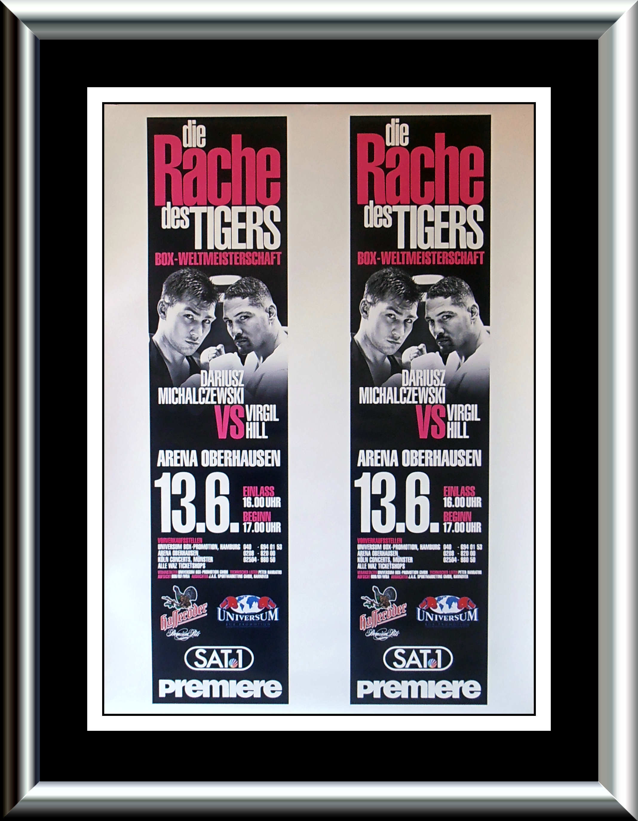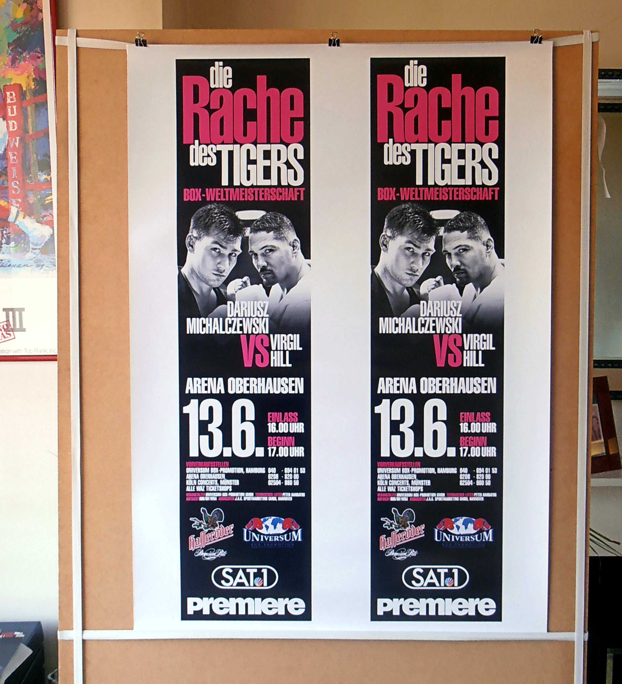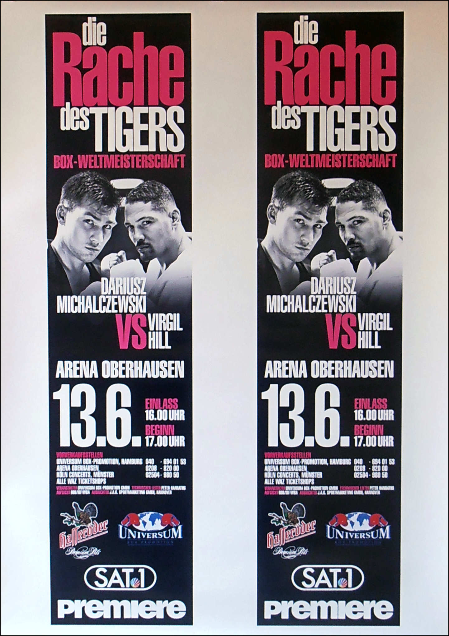 Description : Here we have an original onsite poster from Germany for the Undisputed Light/Heavyweight Championship of the World between reigning & defending WBA & IBF world champion Virgil Hill from America, up against Germany's reigning & defending WBO World Light/Heavyweight Title Holder Dariusz Michalczewski. This fight went the the full distance & was decided by unaminous decision in favor of & the new undisputed Light/Heavyweight Champion of the World....Dariusz Michalczewski. judge: Marcel Roloux 118-110 | judge: Rogelio Perez 117-112 | judge: Samuel Conde Lopez 116-113.