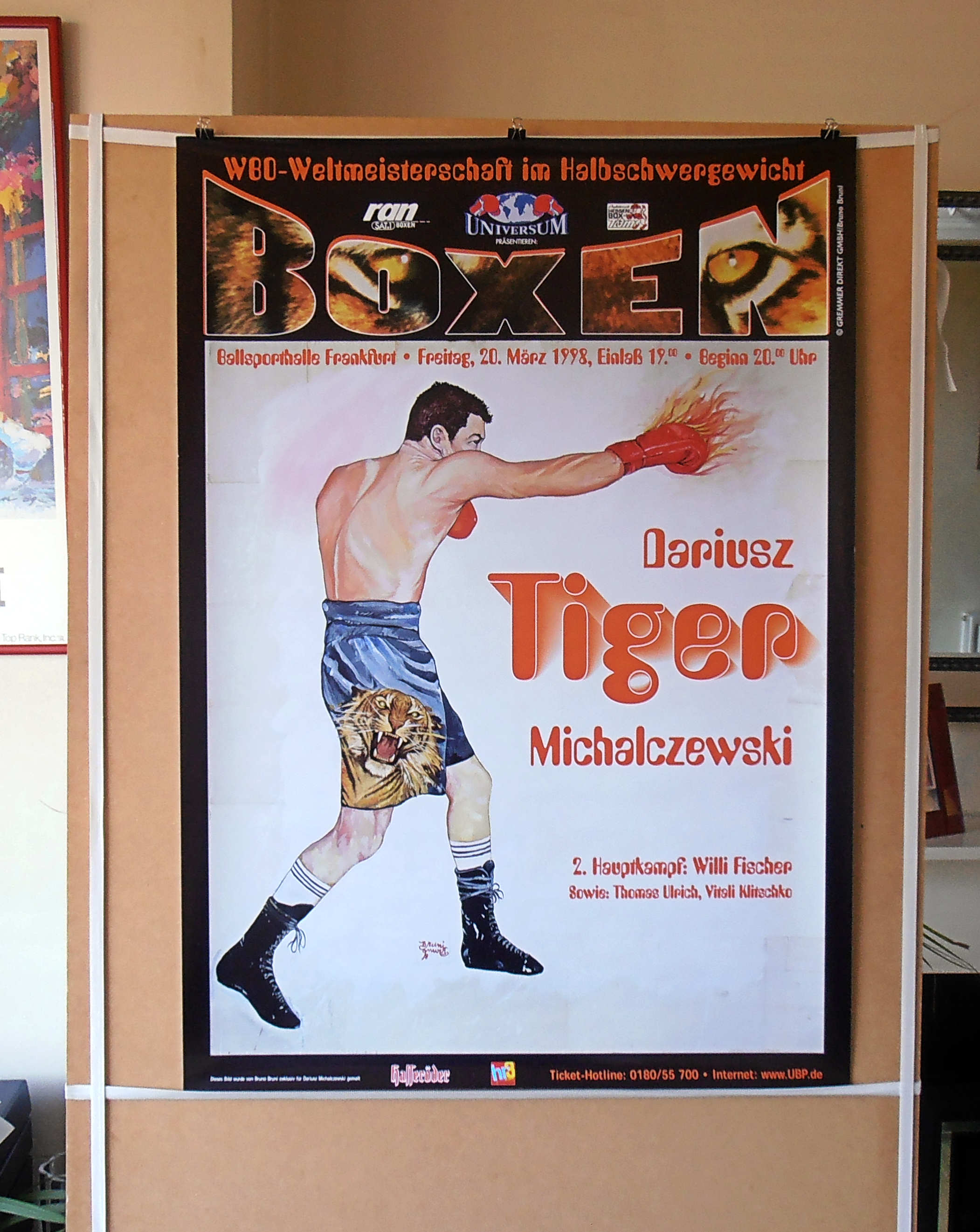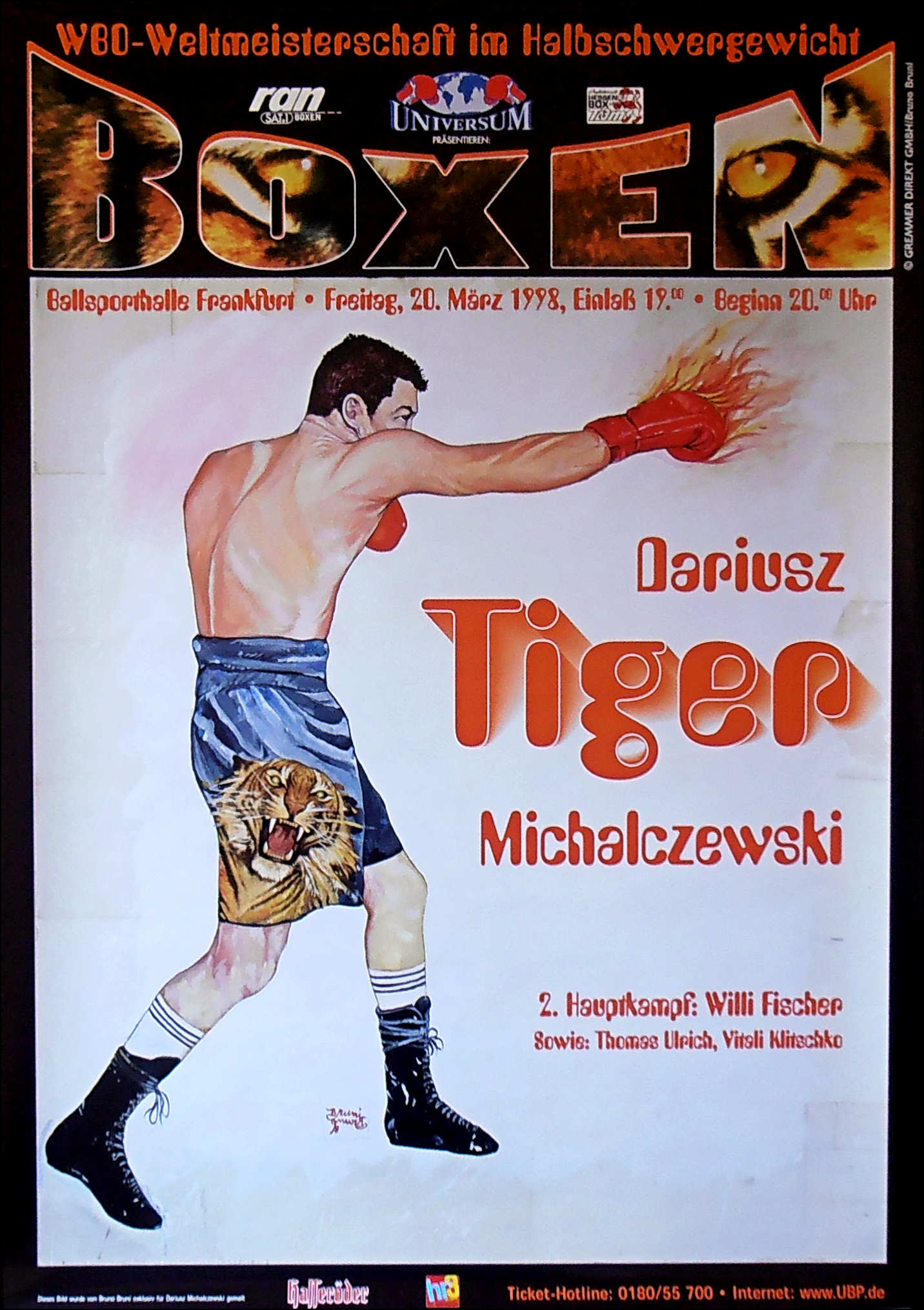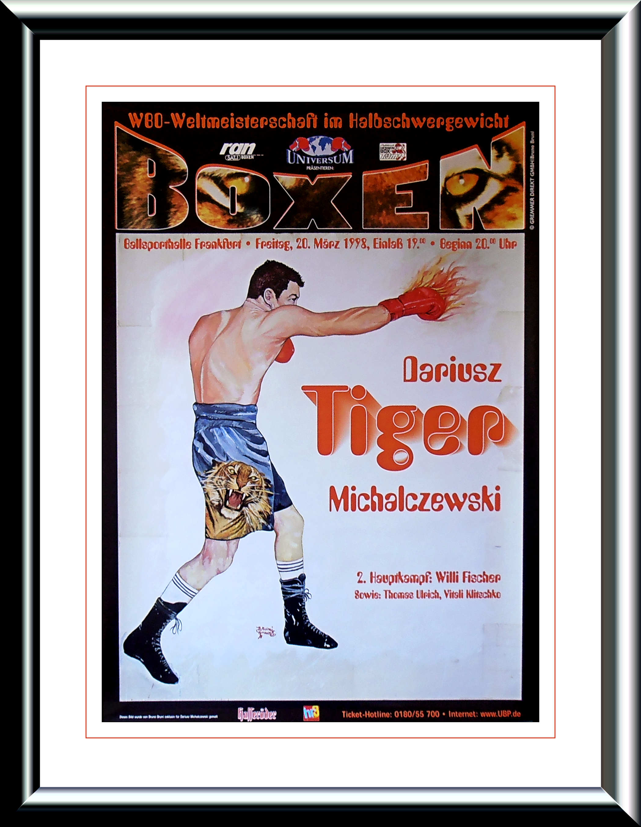 Description : Here we have an original onsite poster from the Ballsporthalle, Frankfurt, Hessen, Germany for the WBO Light/Heavyweight championship between reigning & defending champion Dariusz Michalczewski & challenger Andrea Magi. This fight was settled by 4th round TKO in favor of the champion.