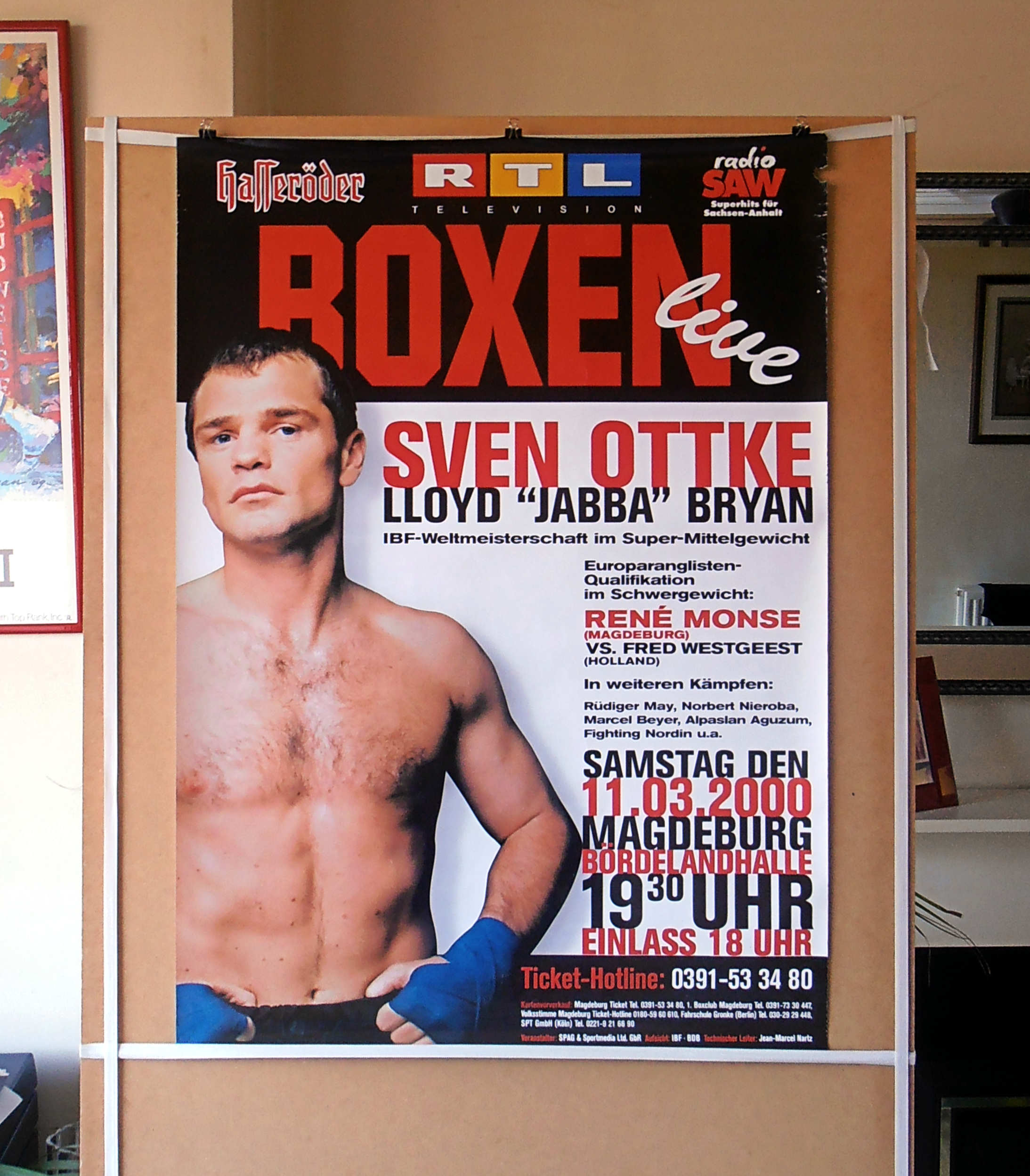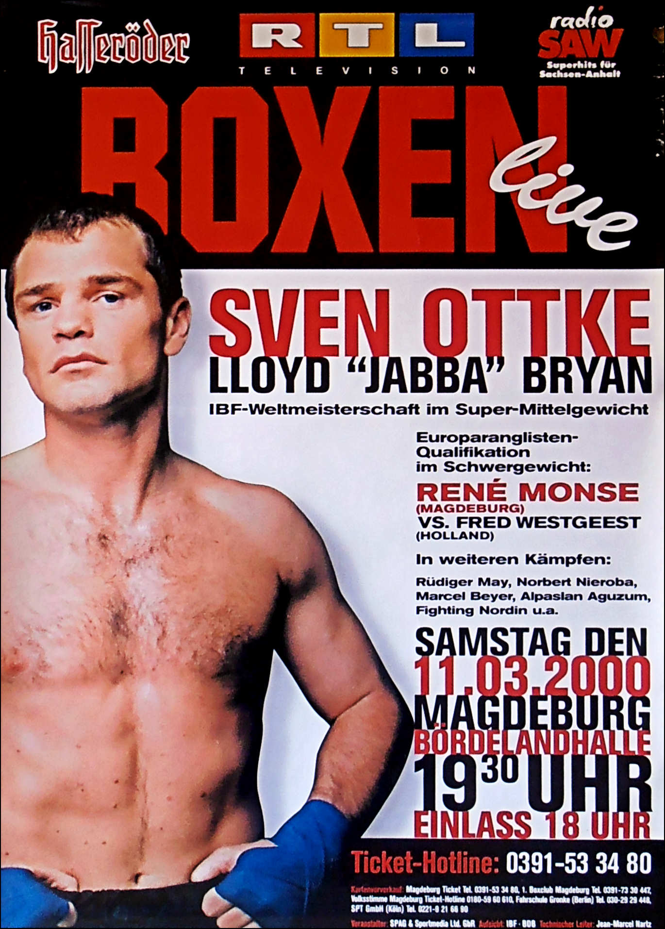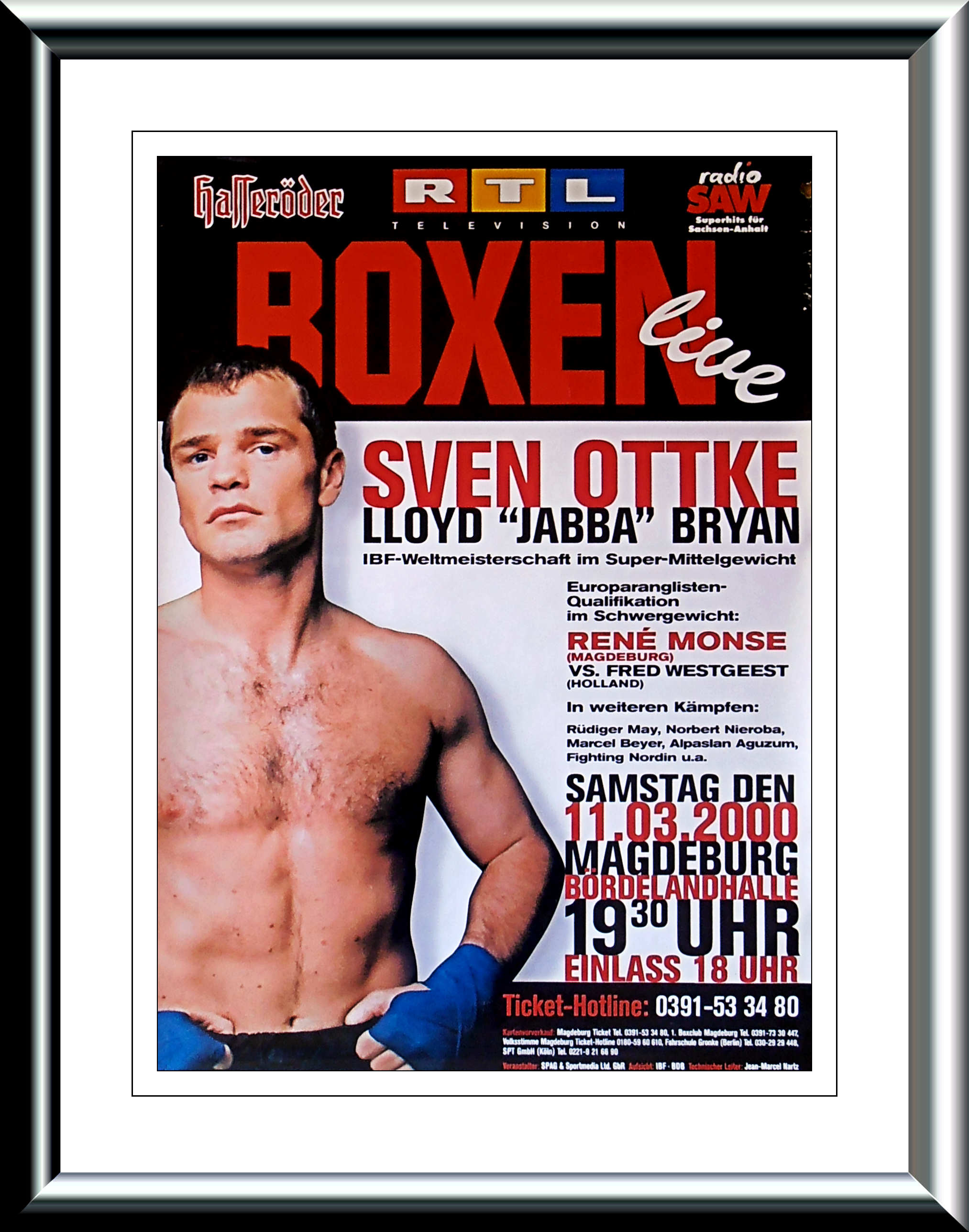 Description : Here we have an original onsite poster from Bordelandhalle, Magdeburg, Sachsen-Anhalt, Germany for the IBF Super/Middleweight Title defence by champion Sven Ottke & challenger Lloyd "Jabba" Bryan. This turned into another Ottke clinic in the 6th defence of his IBF crown with the judges scores as follows, judge: Paul Artisst 117-109 | judge: Remigio Ruggeri 118-108 | judge: Manfred Kuechler 120-106.