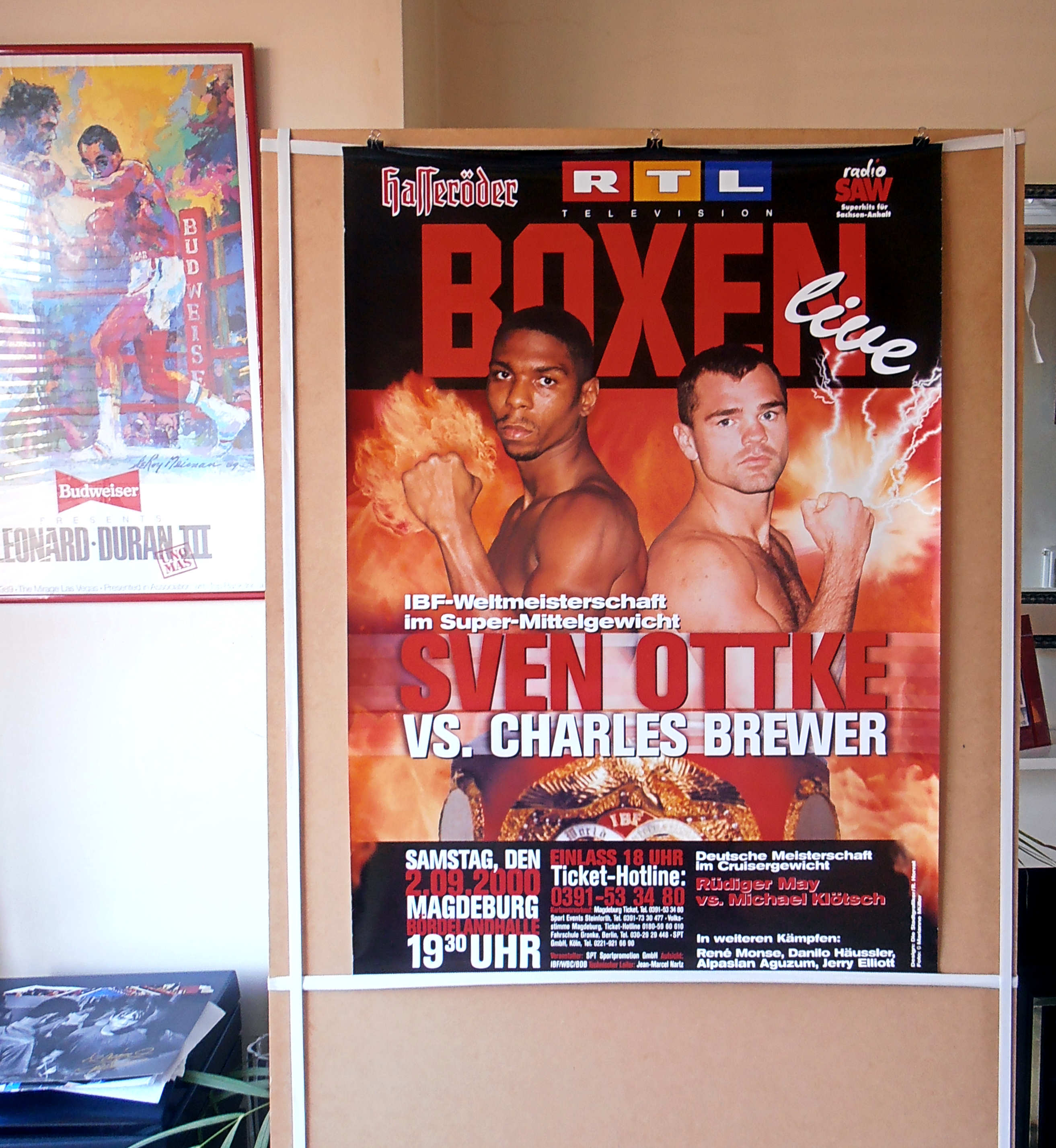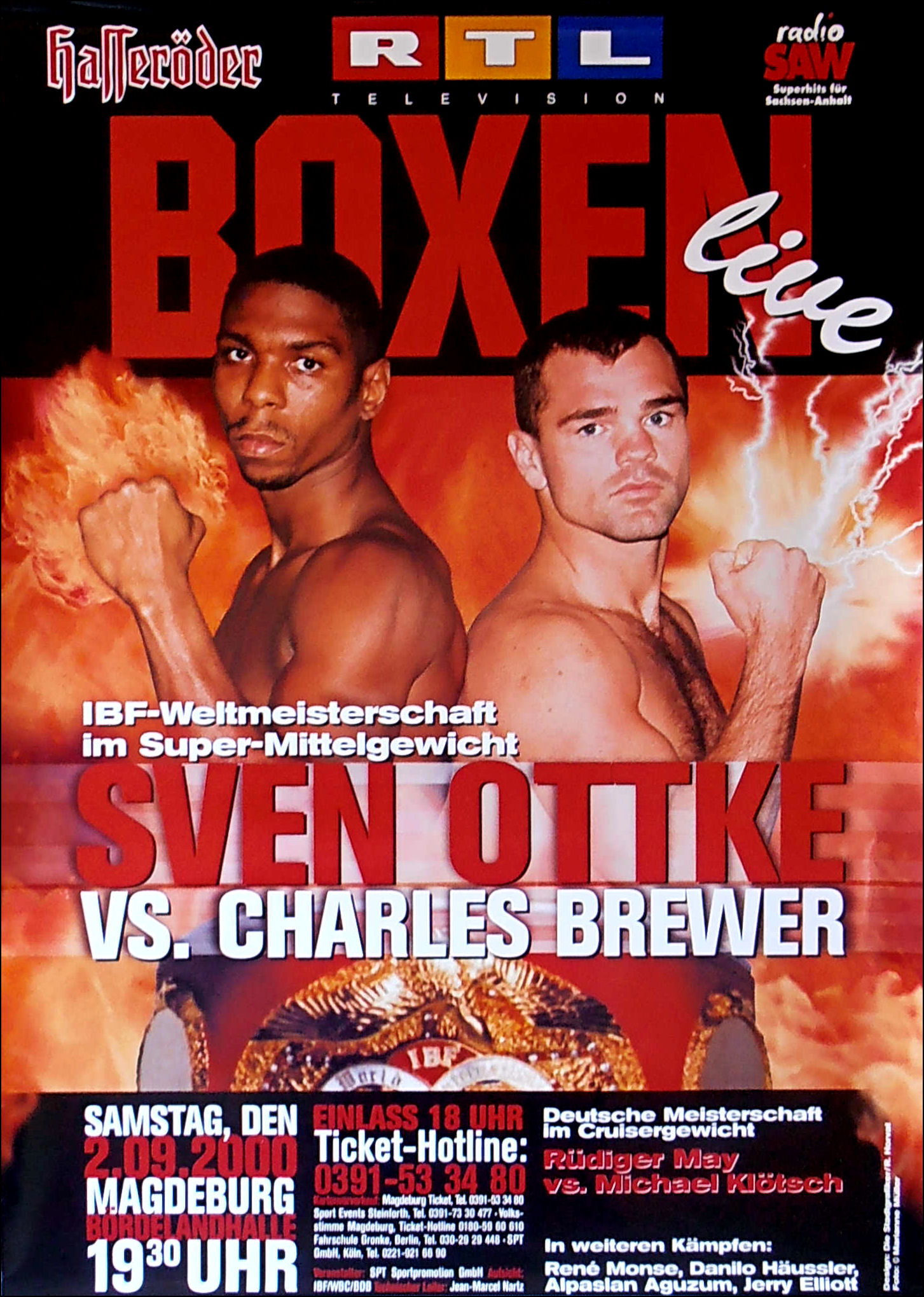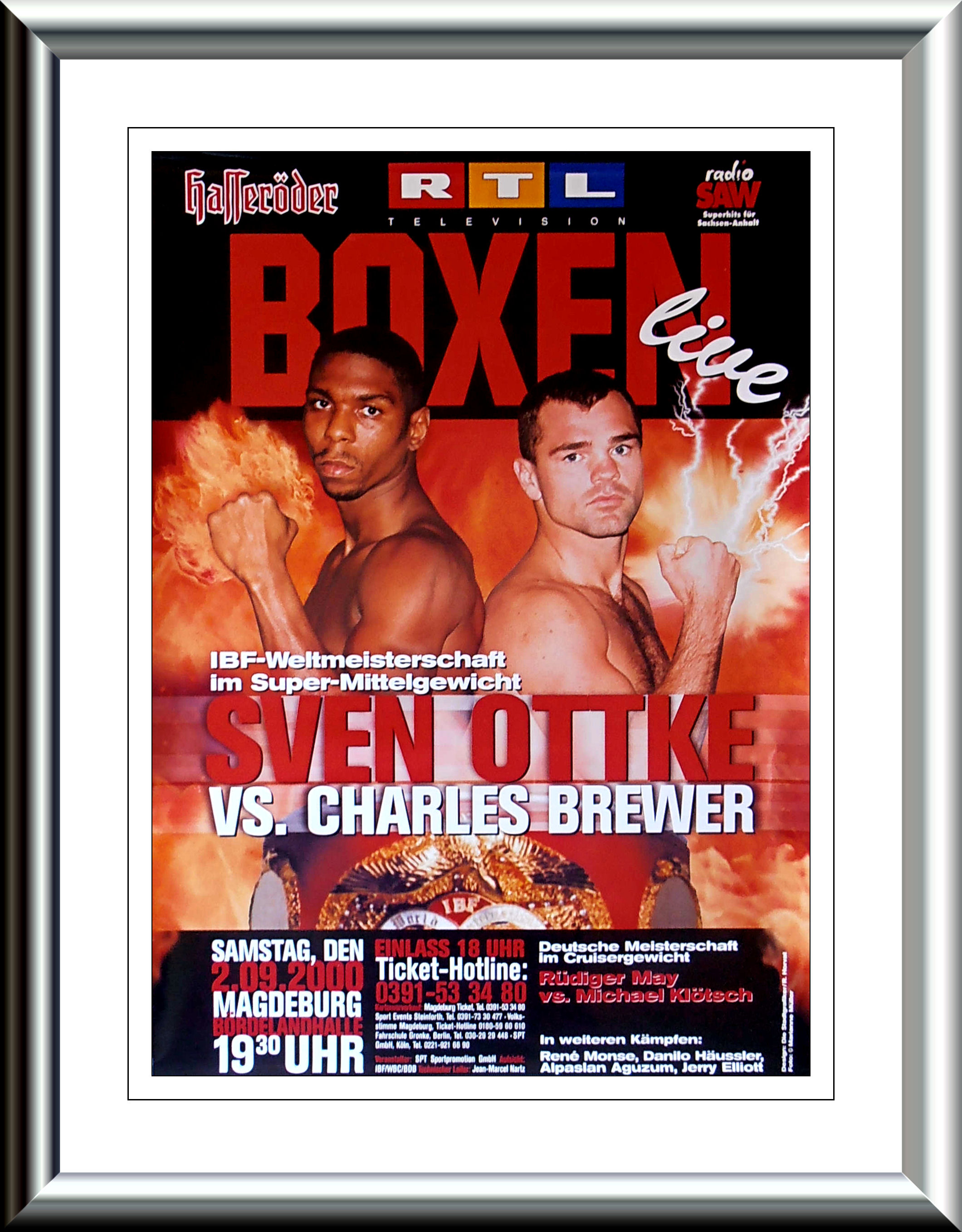 Description : Here we have an original onsite poster from Bordelandhalle, Magdeburg, Sachsen-Anhalt, Germany for the IBF Super/Middleweight Title defence by champion Sven Ottke & challenger Thomas Tate. This was the first of two meetings between these two & on this occasion the fight was decided by split decision in favor of the champion, judge: Artur Ellensohn 116-112 | judge: Manuel Maritxalar 116-111 | judge: Shafeeq Rashada 113-116.