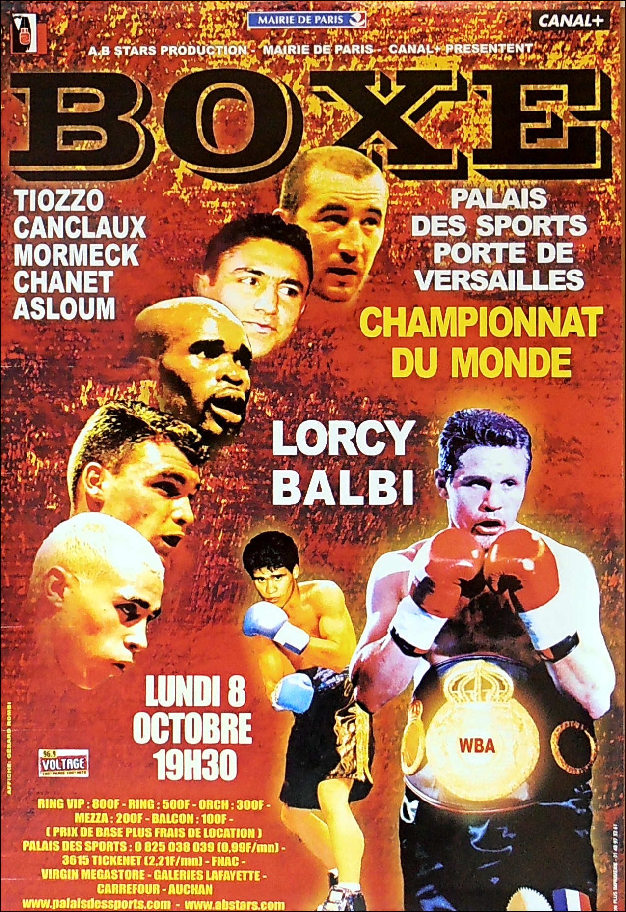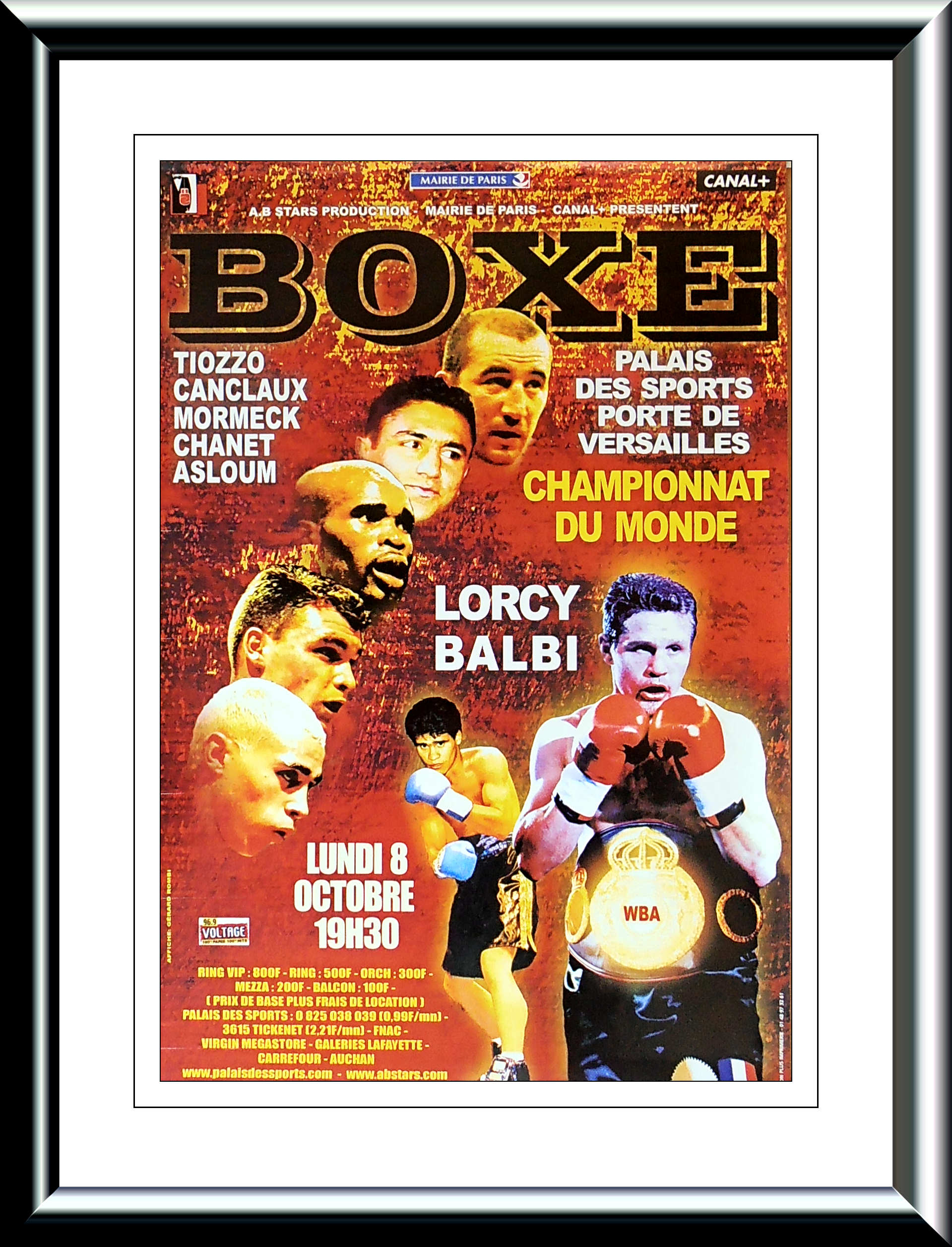 Description : Here we have an original onsite poster from the Palais des Sports, Paris, France for the WBA World Lightweight Title match-up between reigning & defending champion Julien Lorcy & challenger Raul Horacio Balbi from Argentina. This fight was decided by majority decision in favor of & the new WBA lightweight champion of the world, Raul Horacio Balbi. judge: Gustavo Padilla 115-112 | judge: Henk Meijers 117-110 | judge: Ken Morita 114-114