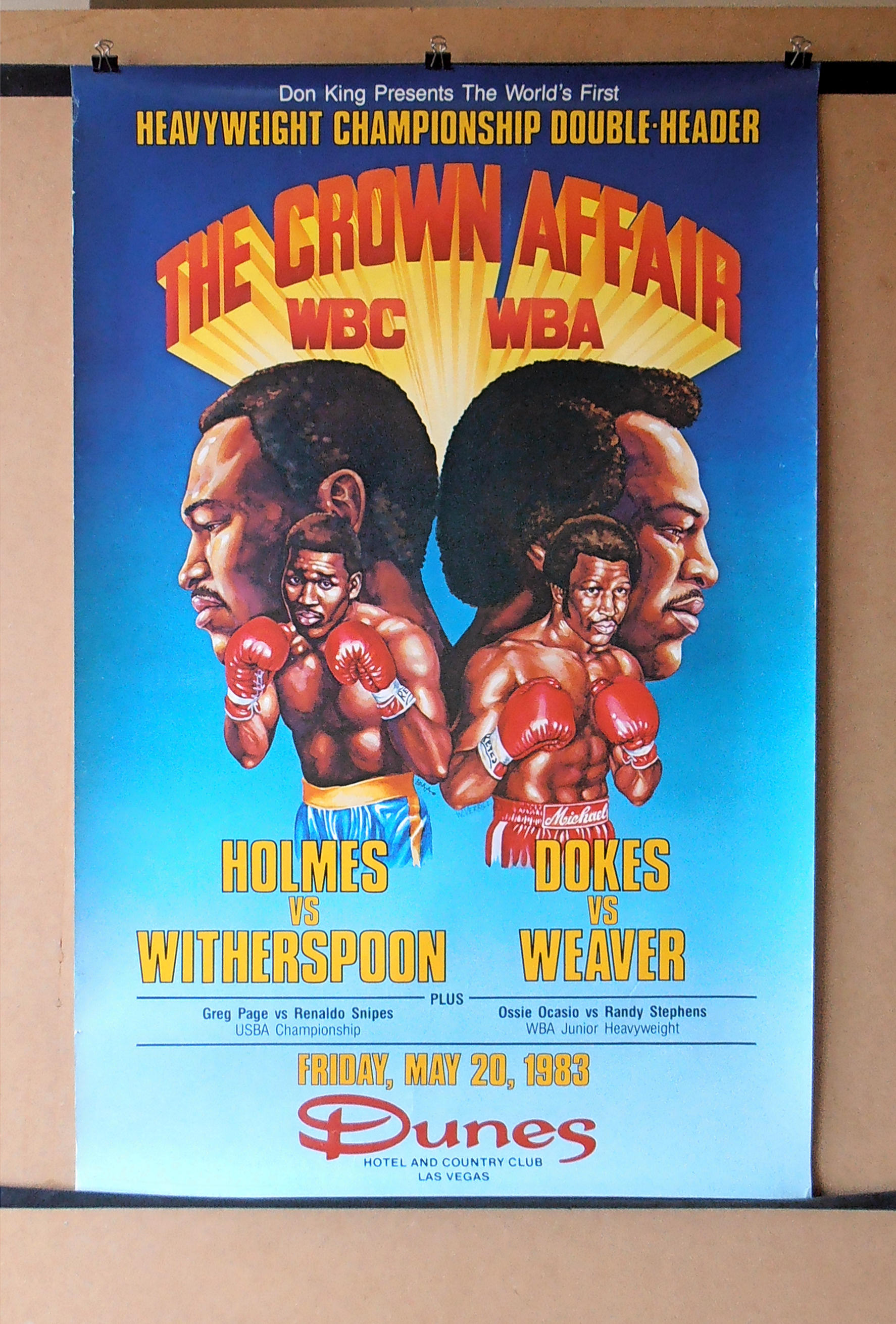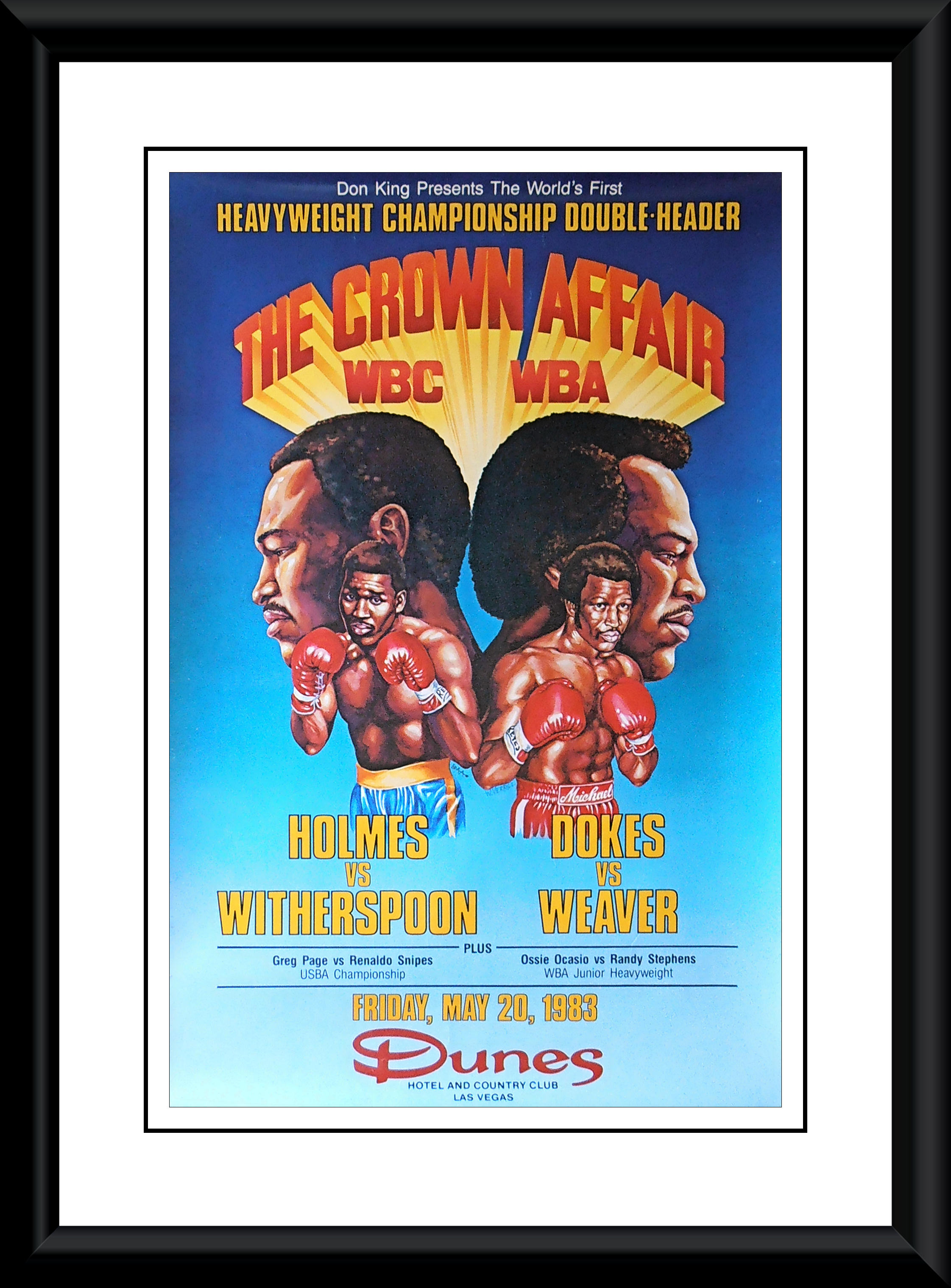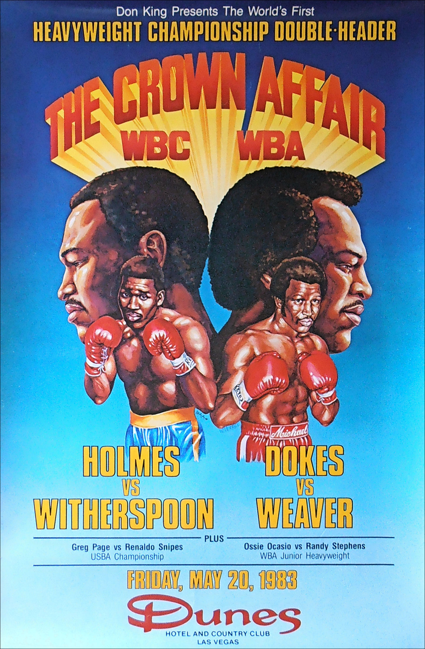 Description : Here we have a rare original vintage old school onsite poster from the Dunes Casino/country club Las Vegas which hosted these dual WBC/WBA World Heavyweight Title fights. First up is the WBC title defence by the reigning & defending champion Larry Holmes vs. the new young upcoming contender 'Terrible' Tim Witherspoon. The WBA title fight was the re-match between the defending champion Michael 'Dynamite' Dokes & forme champion Mike 'Hercules' Weaver, this rematch was ordered due to the contentious 1st round stoppage of Weaver in the first bout.