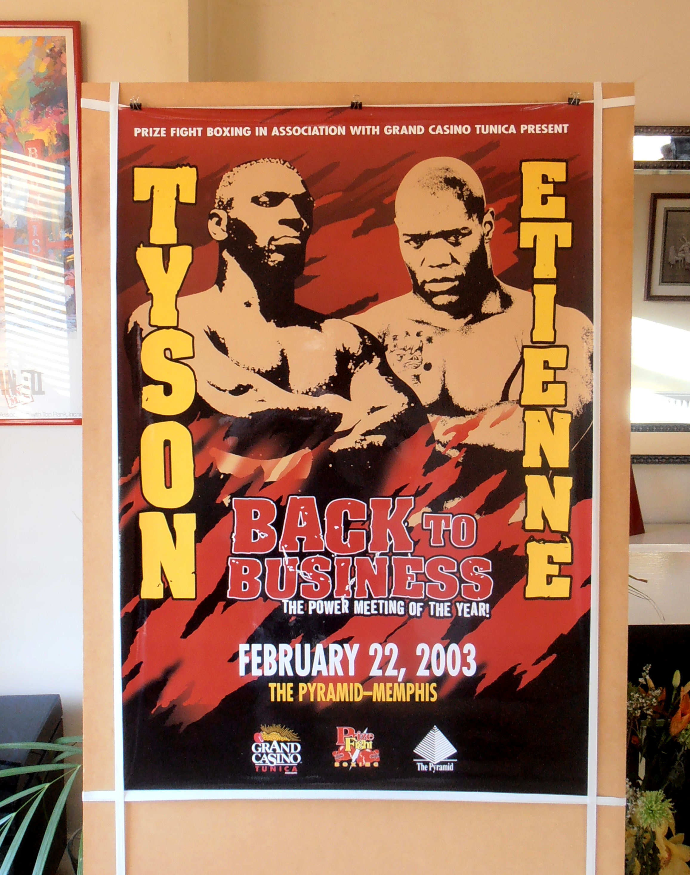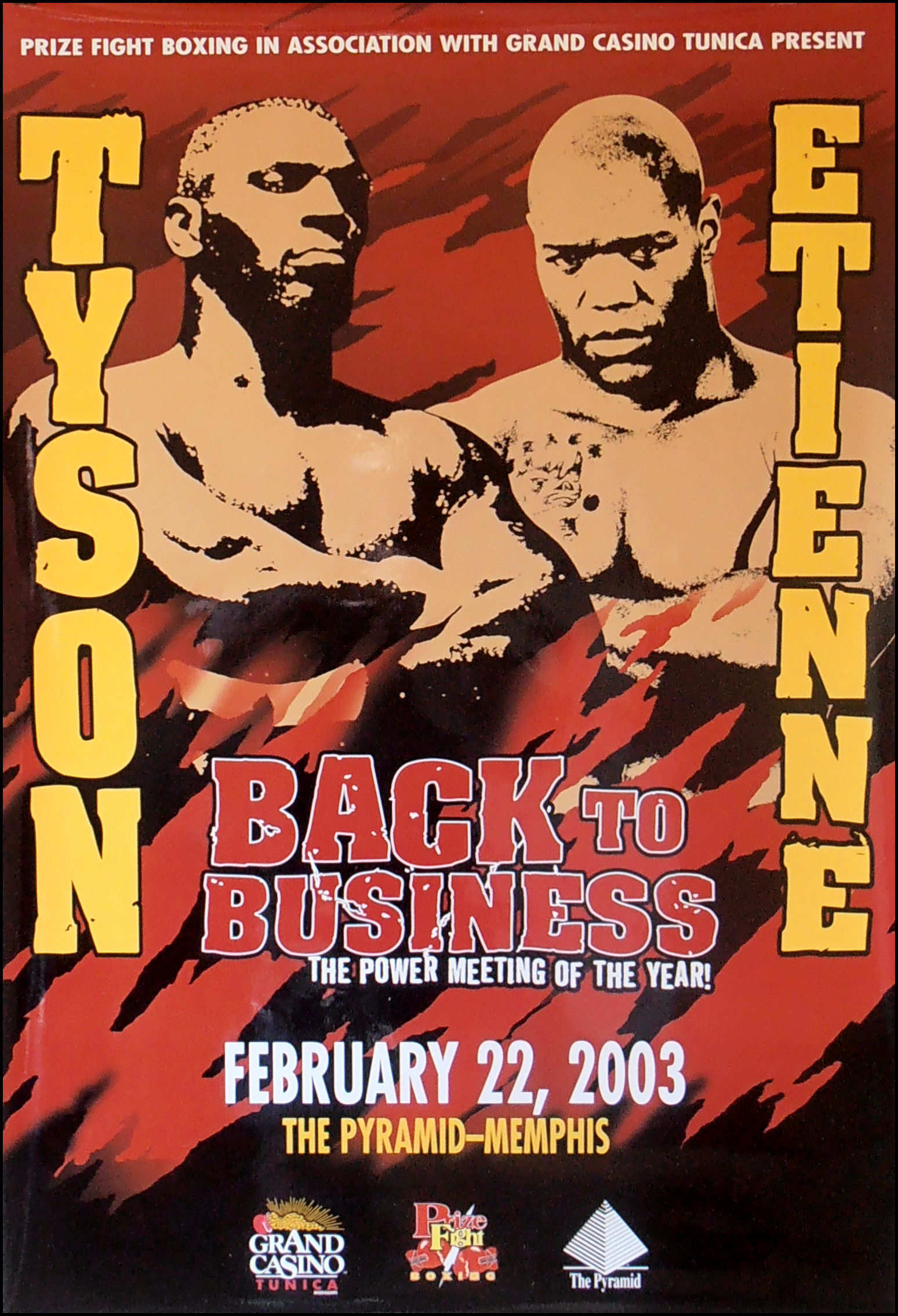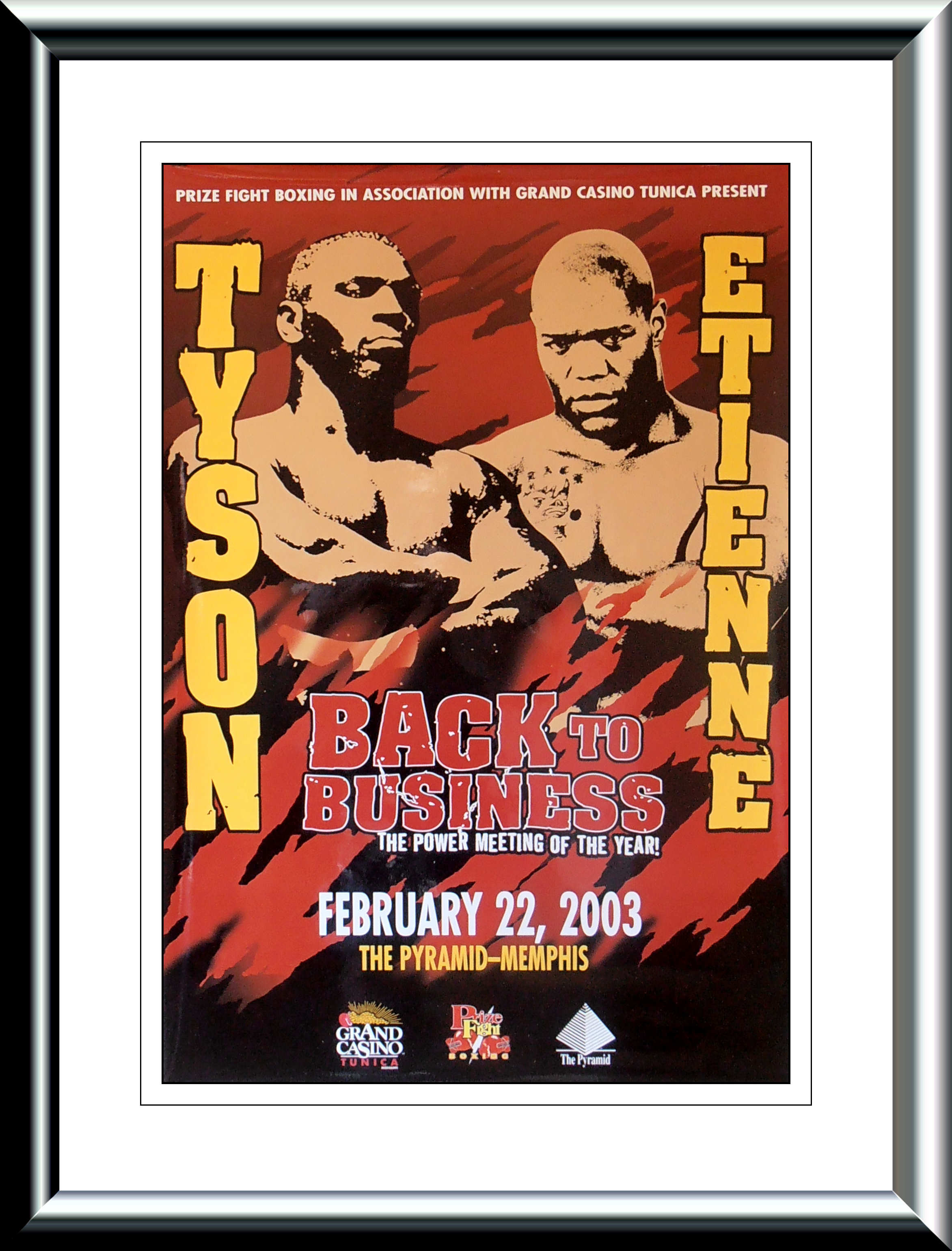 Description : Here we have the super rare official & original Onsite poster from the Pyramid Center Memphis Tennessee, for the February 22, 2003 bout where Tyson beat fringe contender Clifford Etienne 49 seconds into round one. The pre-fight was marred by rumors of Tyson's lack of fitness. It was said that he took time out from training to party in Las Vegas and get a new facial tattoo......Despite concerns about Tyson's condition, the fight would prove to be one of his quickest victories. Tyson would start the match aggressively by throwing powerful combinations at Etienne, causing Etienne to clinch with Tyson, though the combined momentum of the two fighters caused both men to stumble to the mat and he referee then called a brief timeout to allow the fighters to regroup from the fall. After the fight was resumed, Tyson continued to throw wild power punches at Etienne, though none connected. Etienne responded by throwing several power punches of his own which caused Tyson to clinch. After being separated, Etienne missed Tyson with a left jab & right hand combination. Tyson then missed with a left hook, but rebounded with a strong right hand that sent Etienne down. Etienne laid flat on his back and made no attempt to get back up as the referee counted him out. Tyson was then awarded the knockout victory at 49 seconds of the first round. The victory would be the 50th and final one of Tyson's professional career.