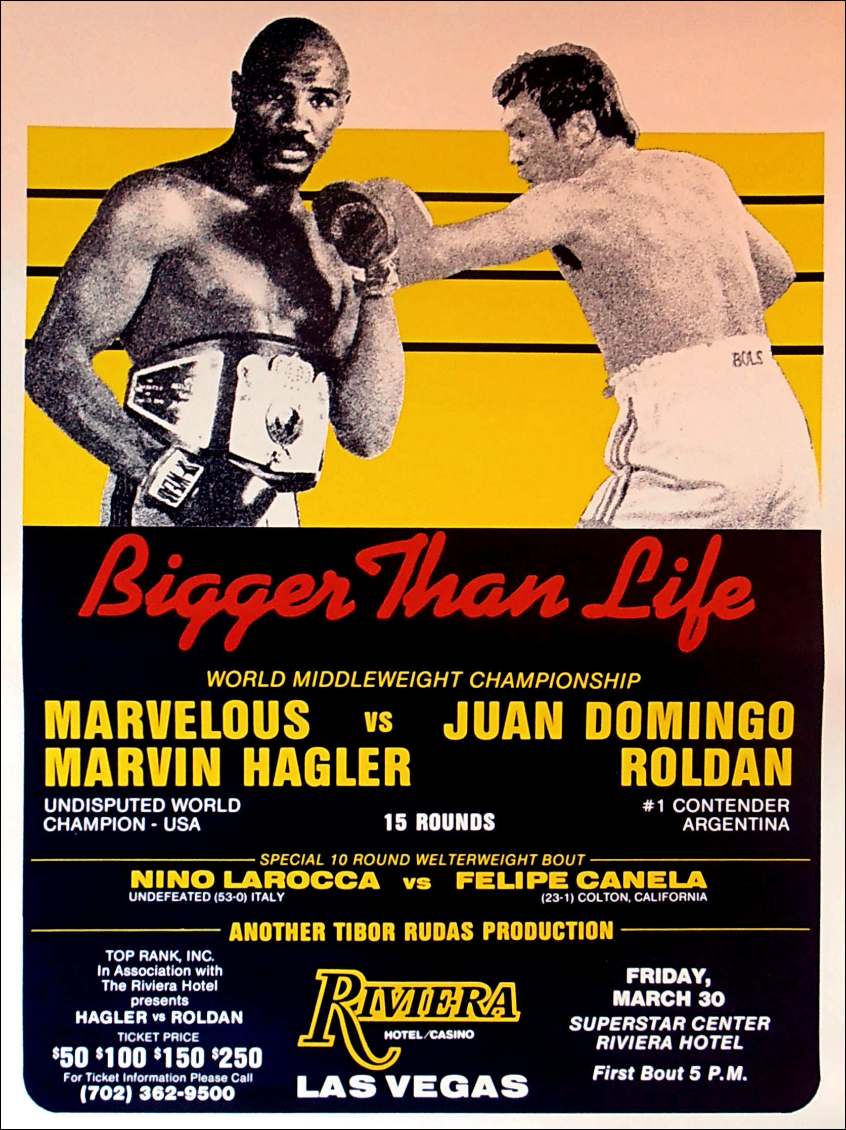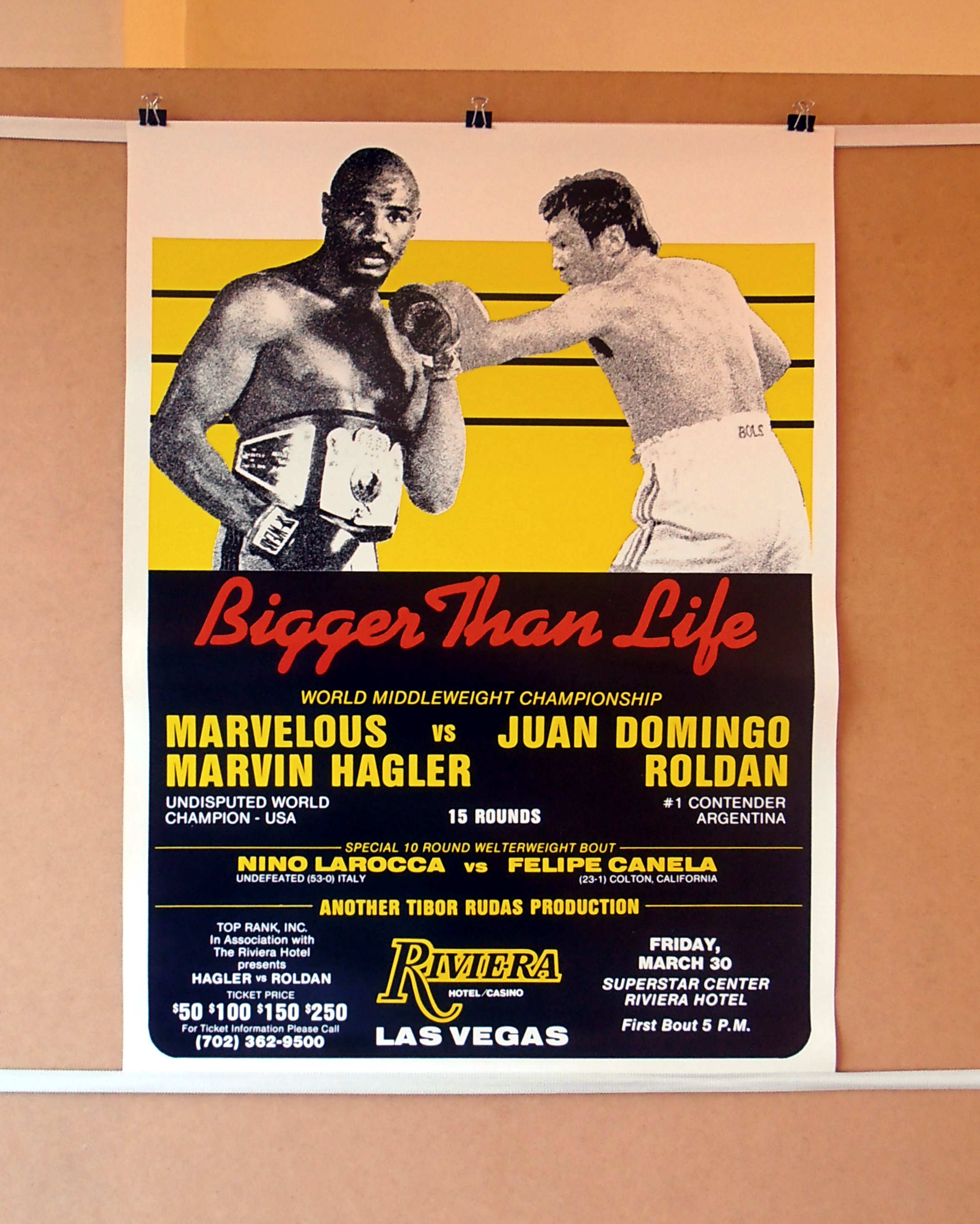 Description : Here we have the super-rare onsite poster from the Riviera Casino, Las Vegas for the Middleweight title defence from the undisputed champion Marvelous Marvin Hagler vs. Juan 'The Hammer' Roldan. The challenger became the only man to be credited with a knockdown of Marvin Hagler, scoring one knockdown seconds into the fight. Hagler protested bitterly that he had been pulled/pushed to the canvas and HBO replay clearly showed that he had indeed been pulled down. Hagler took his revenge though, brutalizing Roldan over ten rounds and stopping him in the middle of round ten.