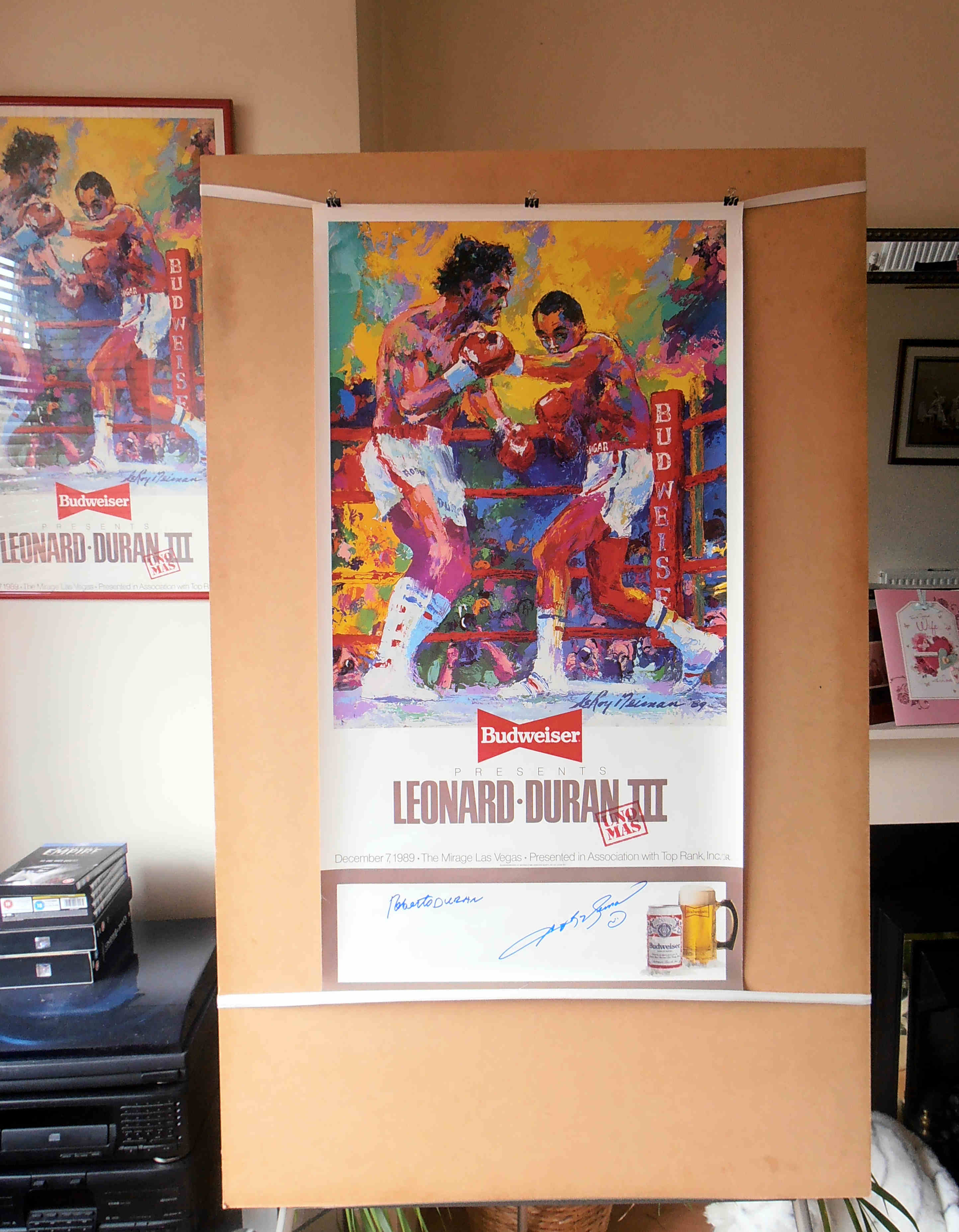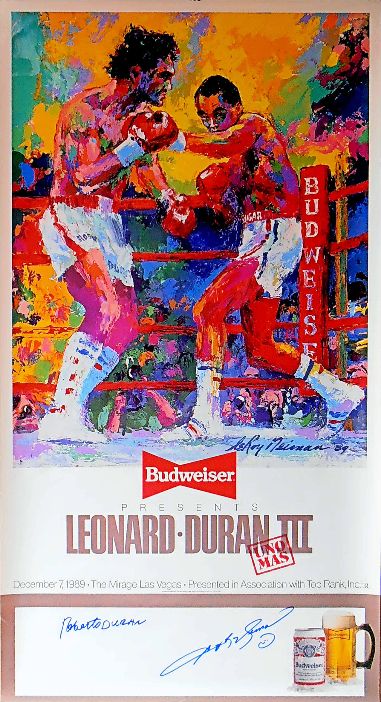 Description : Here we have an original Budweiser official fight sponsors poster from the 3rd fight that has been signed by Roberto Duran & Sugar Ray Leonard. This fabulous poster was designed/painted by the late, great world famous sports artist Leroy Neiman, he captured the tempo of battle from that historic night in Montreal.