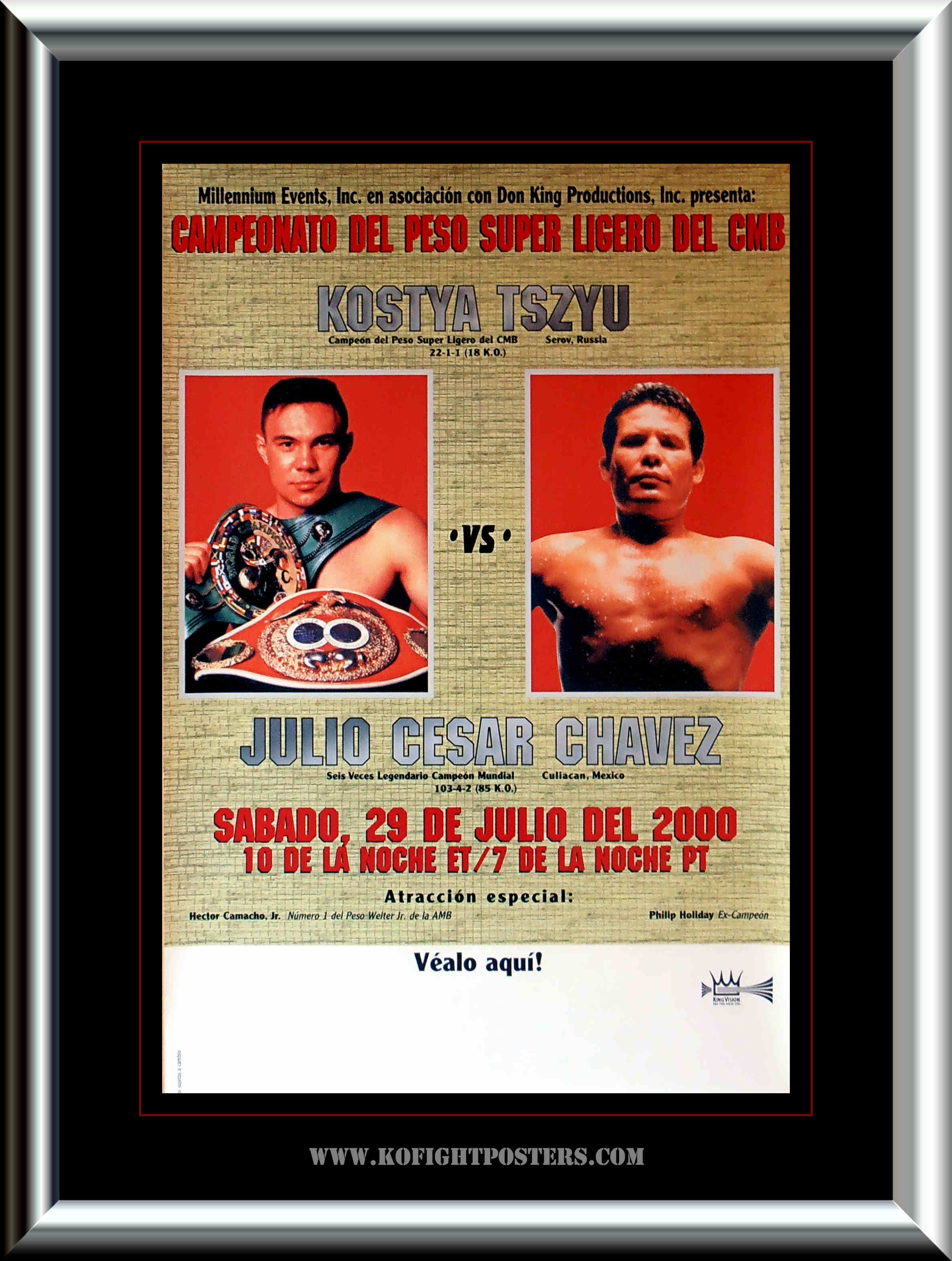 Description : Here we have the super rare original Don King Productions closed circuit for the WBC Light/Welterweight championship. The great Mexican legend Julio Cesar Chavez was hoping to turn back the clock at the age of 38 against the reigning defending champion from Russia via Australia the superb Kostya Tszyu. No turning back the clock here I'm afraid, as the aging Mexican legend Chavez lost the bout via 6th round TKO.