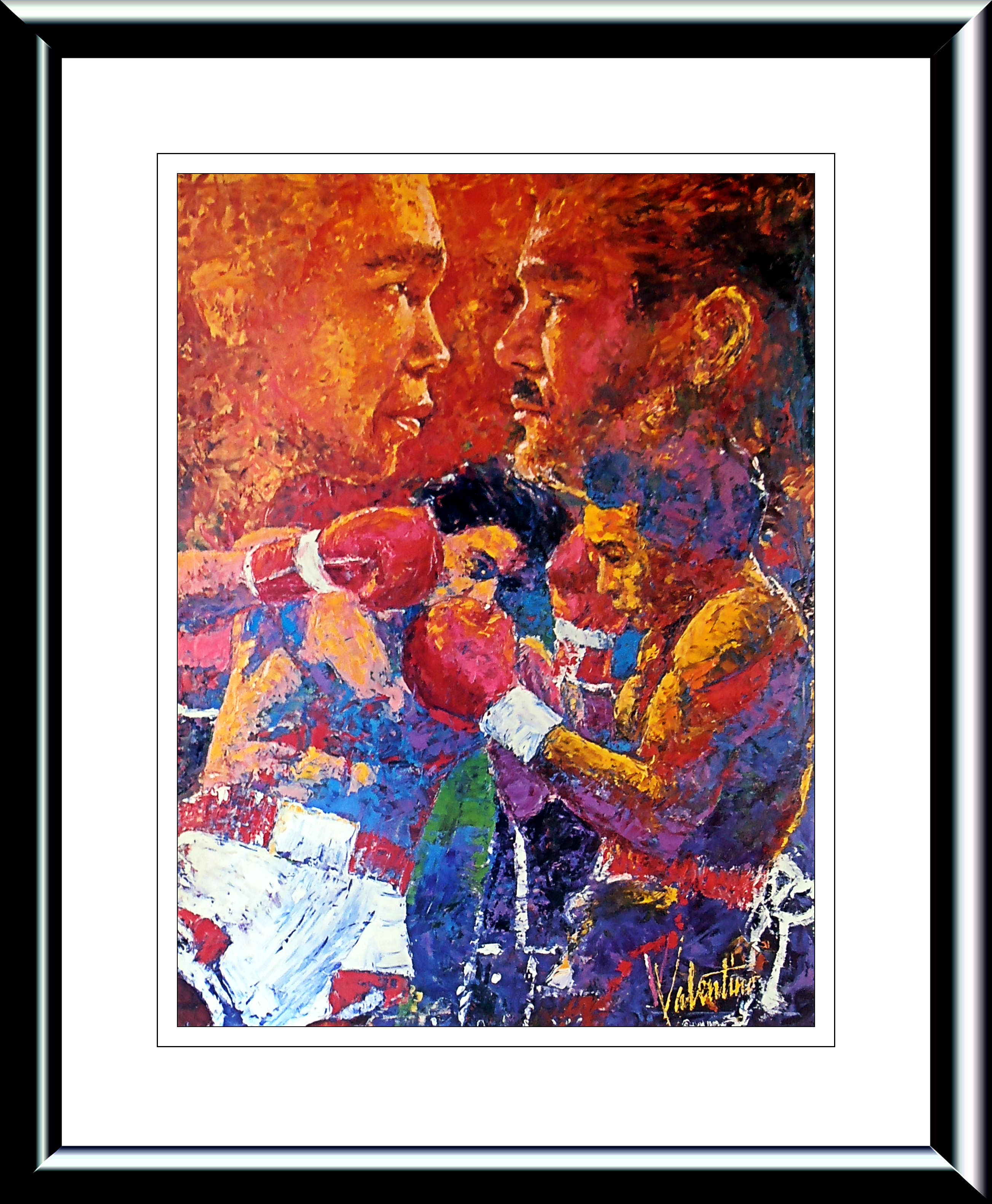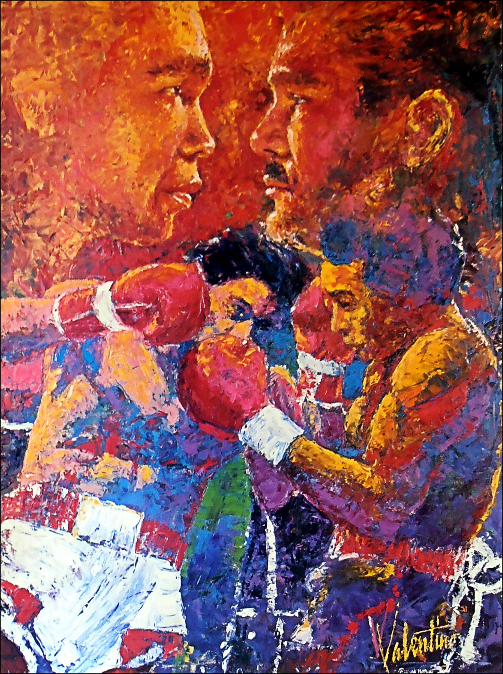 Description : Here we have a mega rare onsite boxing art poster sent out too VIP/High Roller invitee guests. The Mirage commissioned the American artist 'Valentino' to depict the fury & intensity of the rivalry of the 1st battle in Montreal June 20th 1980 between these two legends of the ring, like Leroy Neiman, who did the official "Budweiser" official fight night sponsors poster, Valentino captured the essence of Violence of the 'Brawl in Montreal' in this superb depiction of Duran bearing down on Leonard.