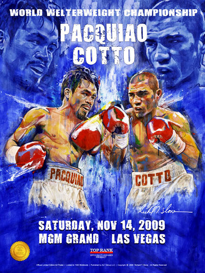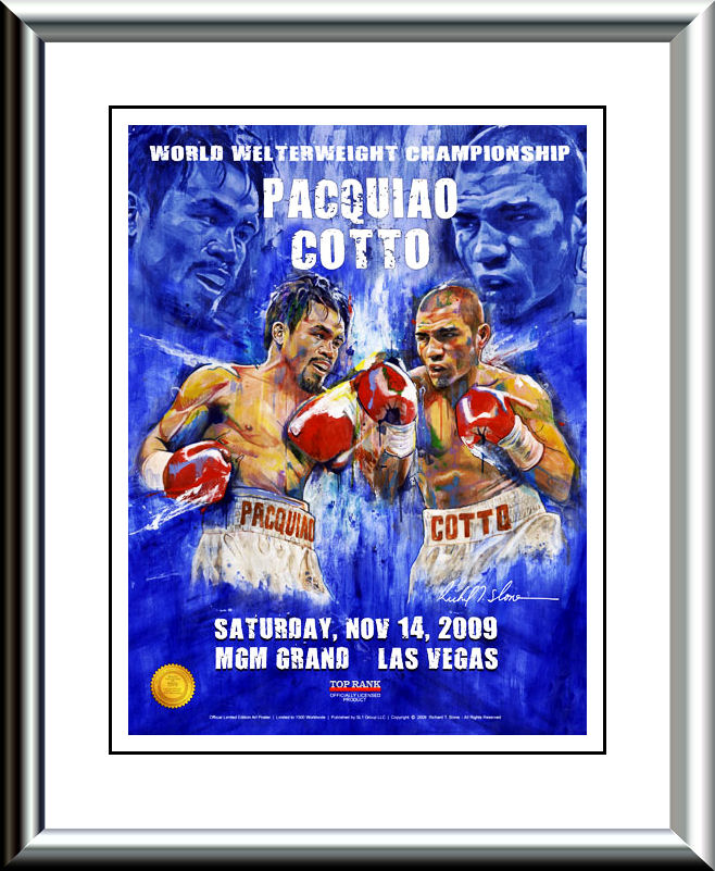 Description : Official Slone art limited edition MGM Grand commissioned onsite poster from the showdown at the MGM Grand Garden Arena in Las Vegas for the WBO Welterweight Title. Another great fight that I was so fortunate to be in attendance at the MGM grand Garden Arena. I myself thought that this was a step to far for Manny Pacquiao & I favored Miguel Cotto to win big-time!