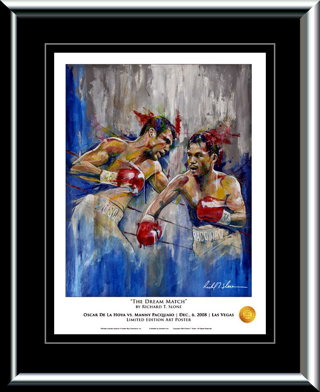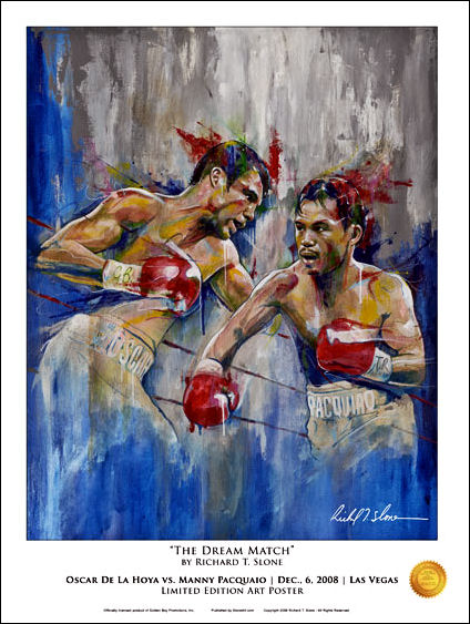 Description : Official Slone art limited edition MGM Grand commissioned onsite poster from the De La Hoya Super-Fight at the MGM Grand Garden Arena in Las Vegas from that historic night when he defeated Oscar De La Hoya in a shocking upset that sent Oscar into retirement & launched Manny Pacquiao into Super Stardom!